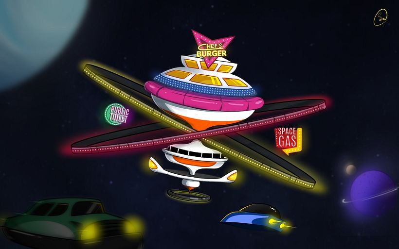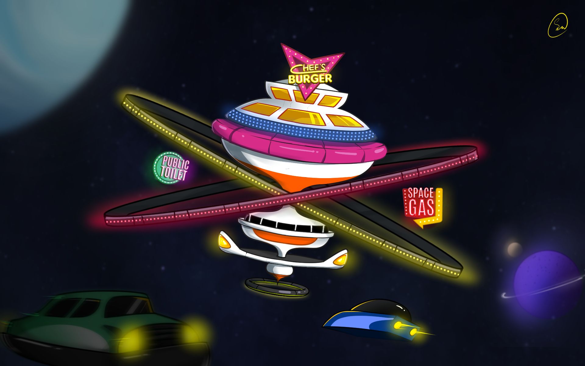 Welcome to Space Burger Diner a retro-futuristic roadside hangout floating somewhere in the cosmos.