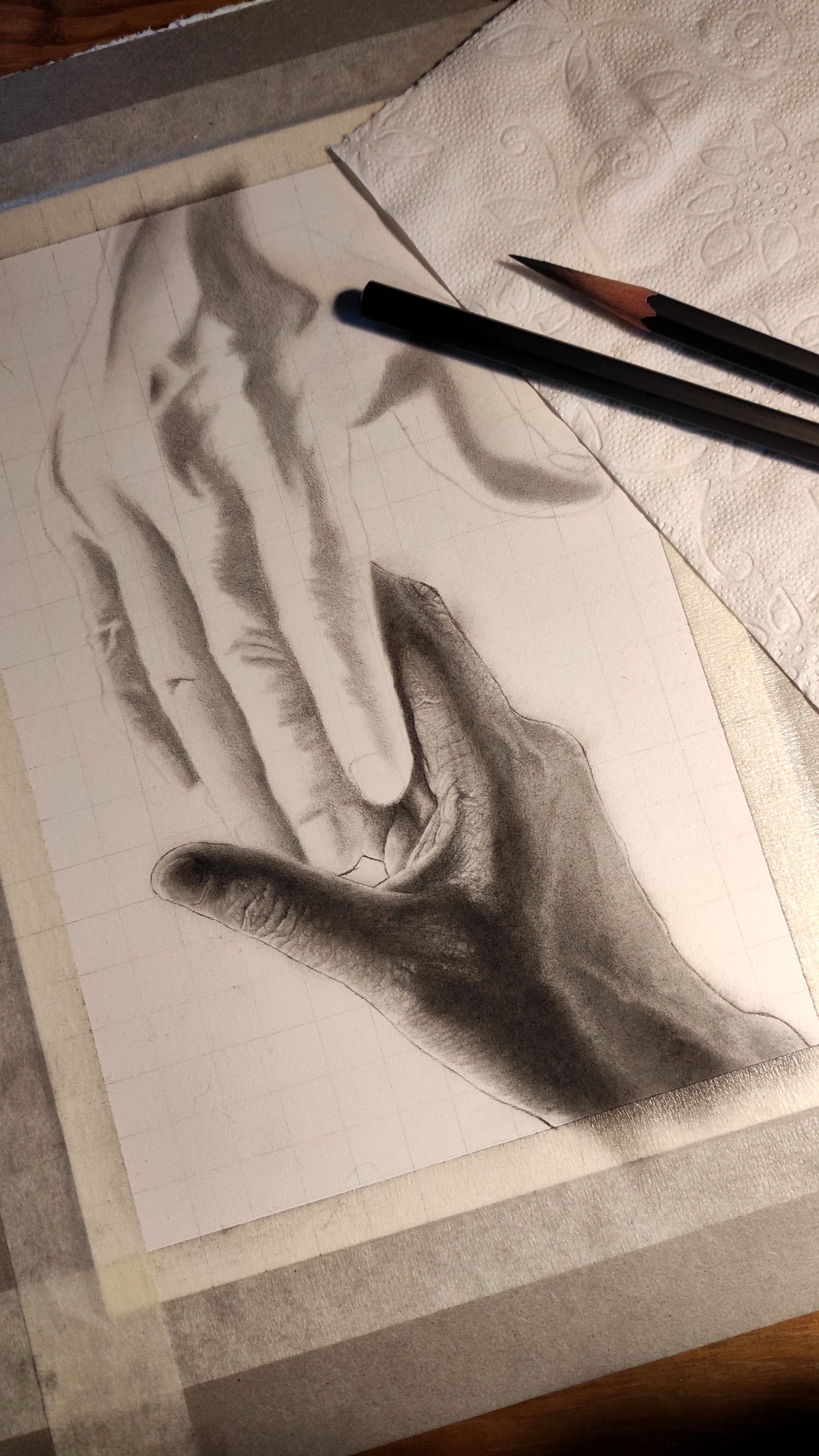 Trabalho realmente incrível! Vejo tanto potencial e talento no seu trabalho. Mãos são notoriamente difíceis de acertar, especialmente por causa do formato delas. Muito bem feito! Seu uso de valores tonais também é ótimo. Minha única sugestão aqui é manter o papel limpo nas áreas onde você gostaria de realces fortes. Isso ajudará essas áreas a se destacarem ainda mais. Para esfumar uma área sem perder nenhum detalhe, costumo usar pequenos pedaços de algodão, esfumar tocos ou pincéis secos e, em seguida, continuar aplicando camadas com detalhes e texturas.