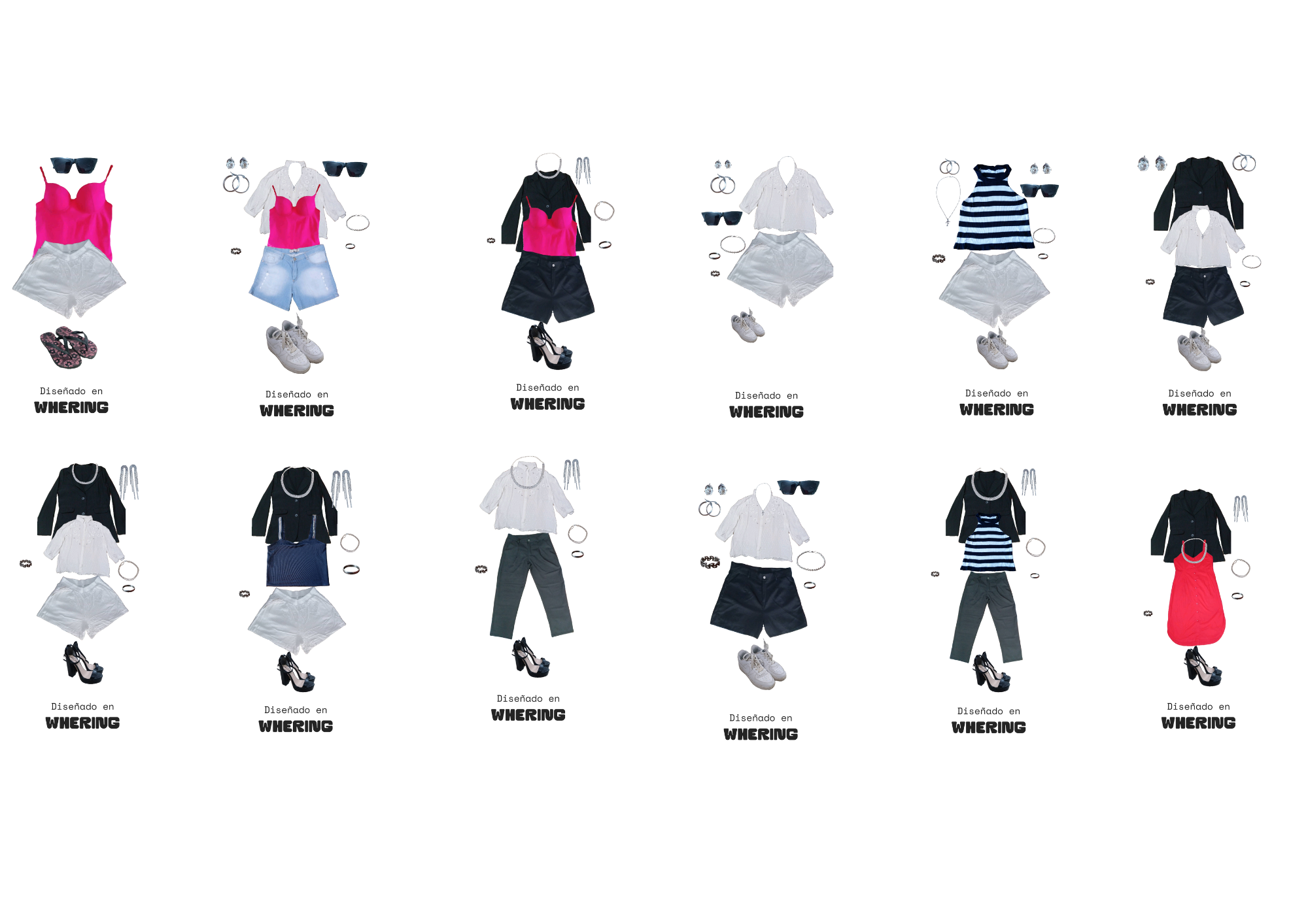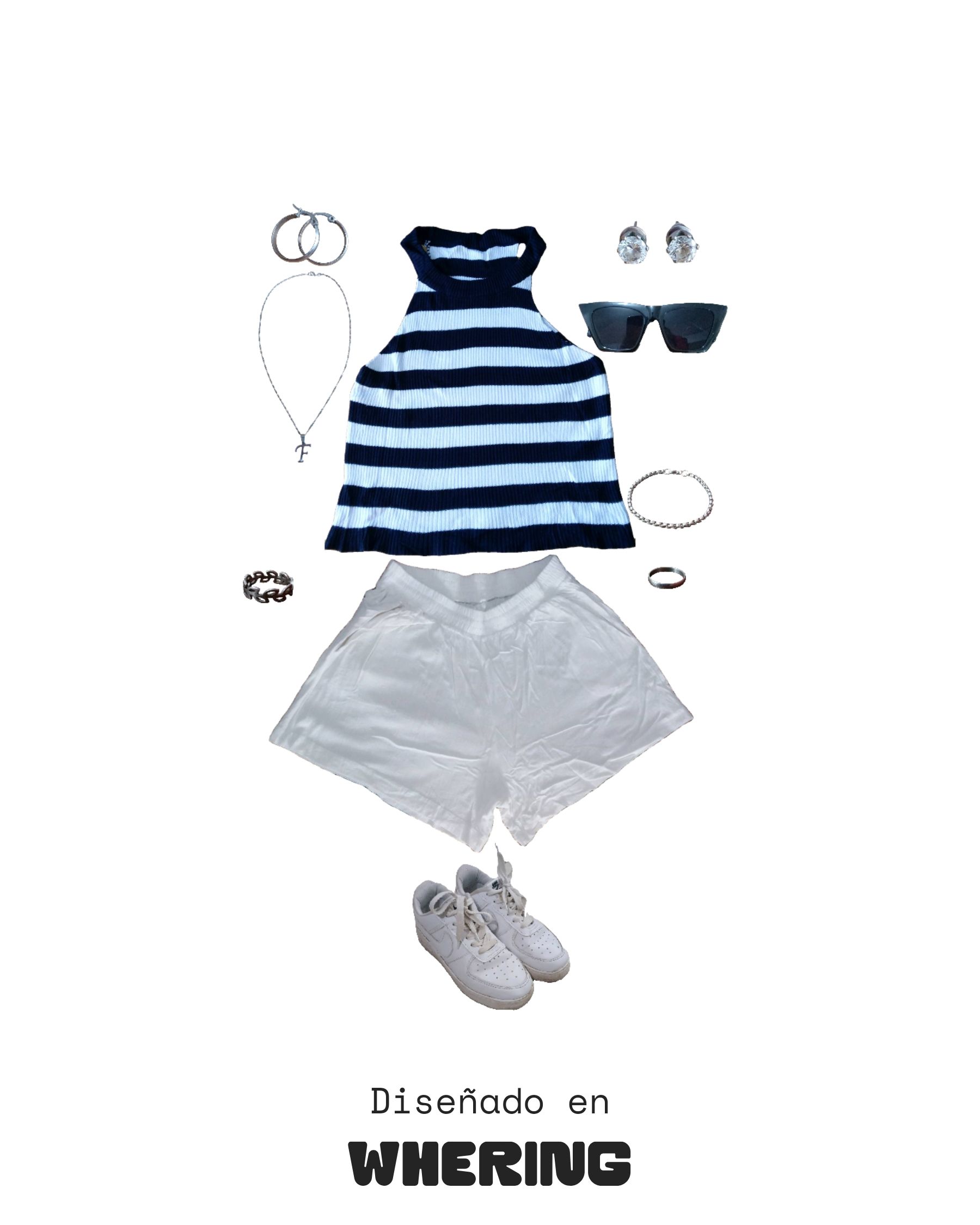 Casual: Top halter tejido rayado blanco y negro, short de lino blanco, zapatillas blancas, lentes de sol, anillos, aros, pulsera y cadenita.