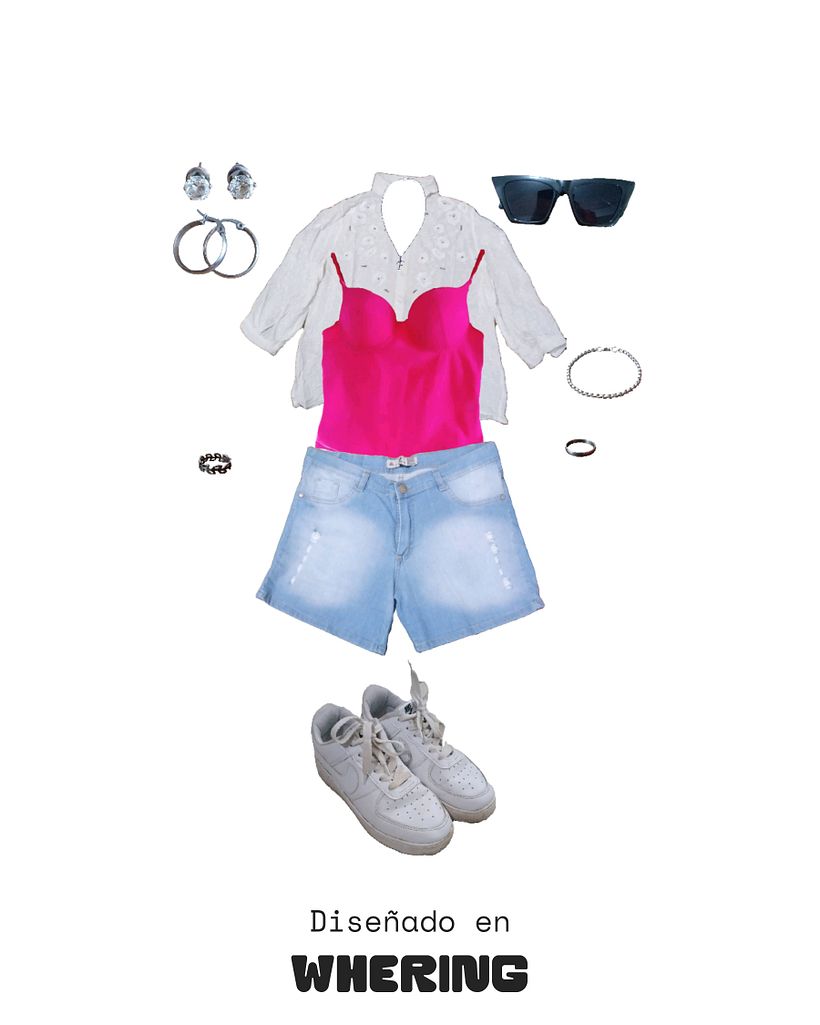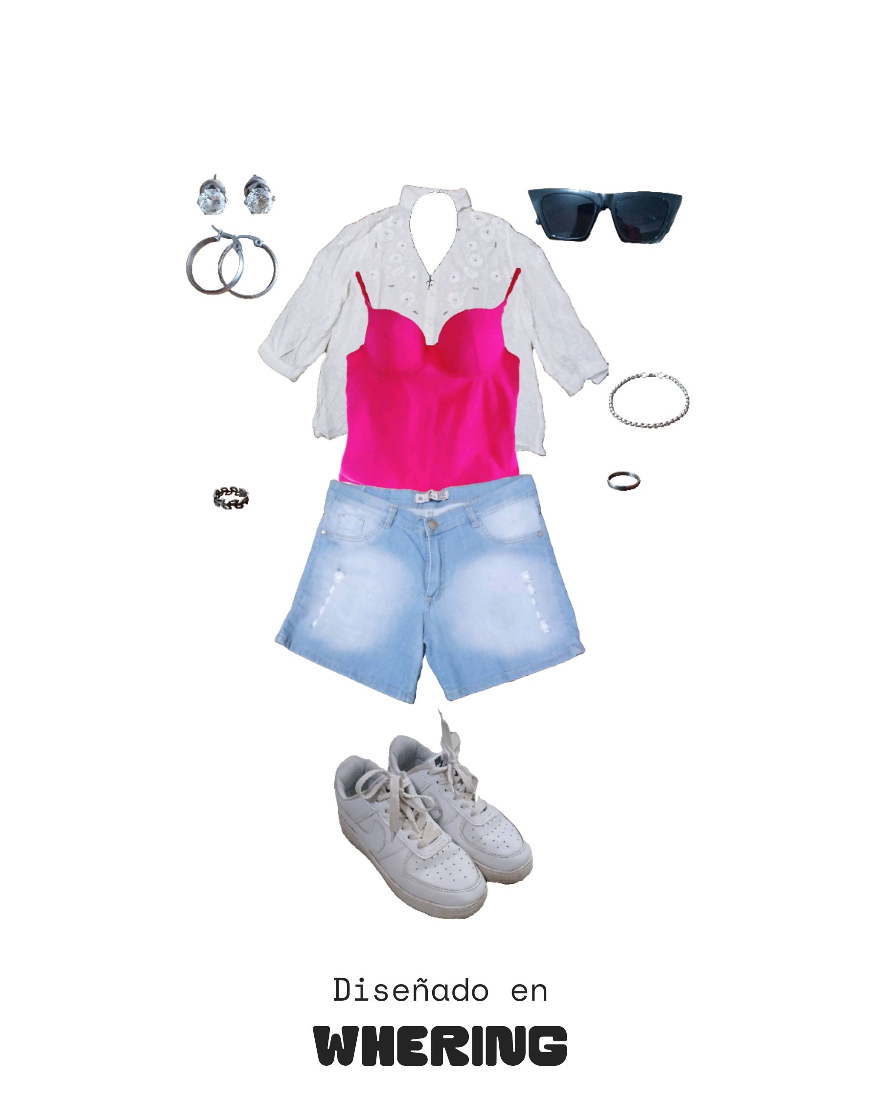 Almuerzo: Enteriza fucsia, short de jean, zapatillas blancas,camisa blanca con bordados, aros, anillos, pulsera, cadena y lentes de sol.