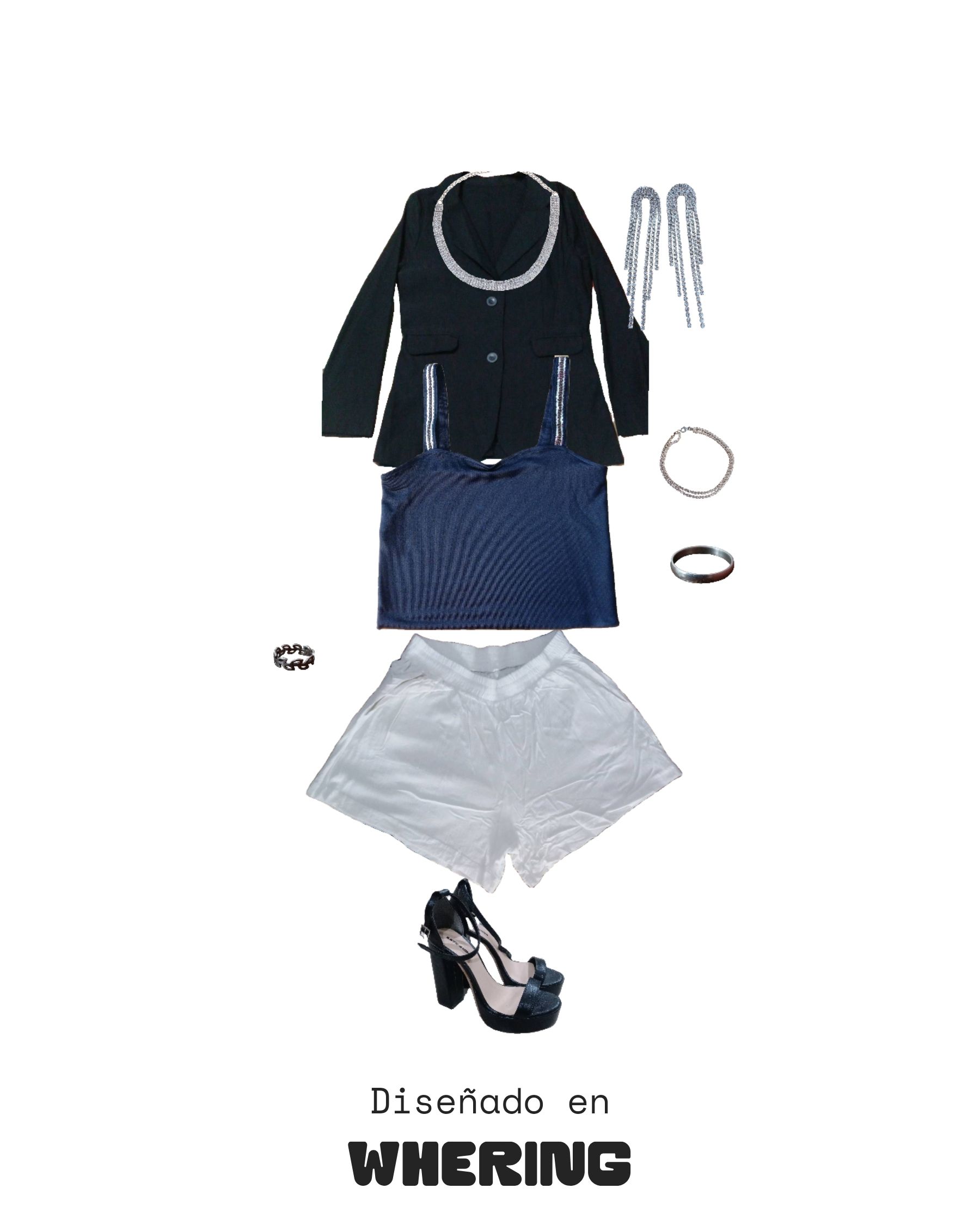 Nocturno: Blazer negro, top negro con lentejuelas en los tirantes, short de lino blanco, sandalias negras de taco alto, anillos y collar de strass a juego con aros y pulsera.