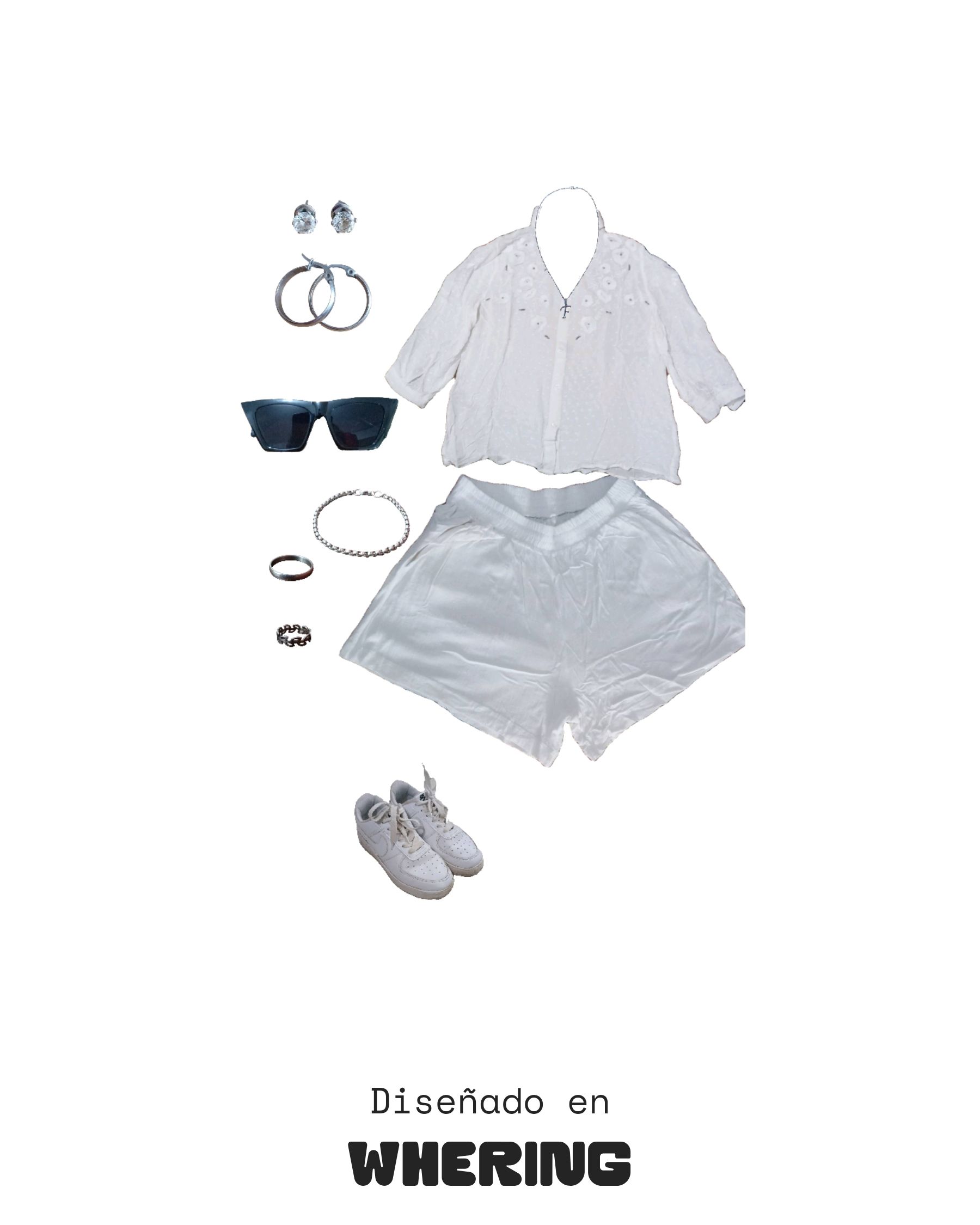 Casual: Short de lino blanco, camisa blanca, zapatillas blancas, lentes de sol, anillos, aros, pulsera y cadenita.