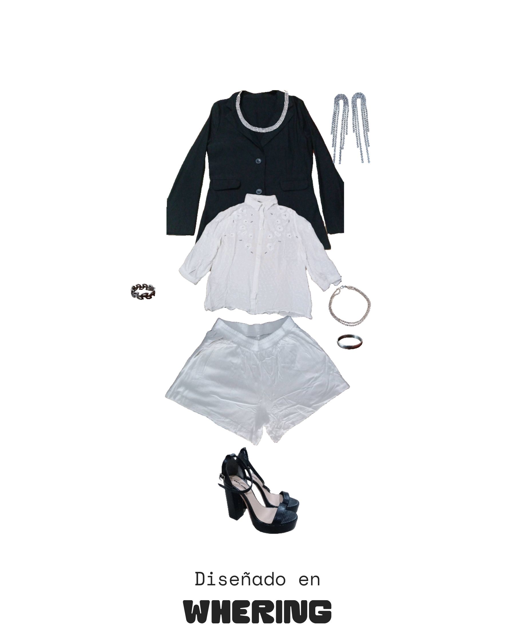 Nocturno: Short de lino blanco, camisa blanca, sandalias negras de taco alto, blazer negro, anillos y collar de strass a juego con aros y pulsera.