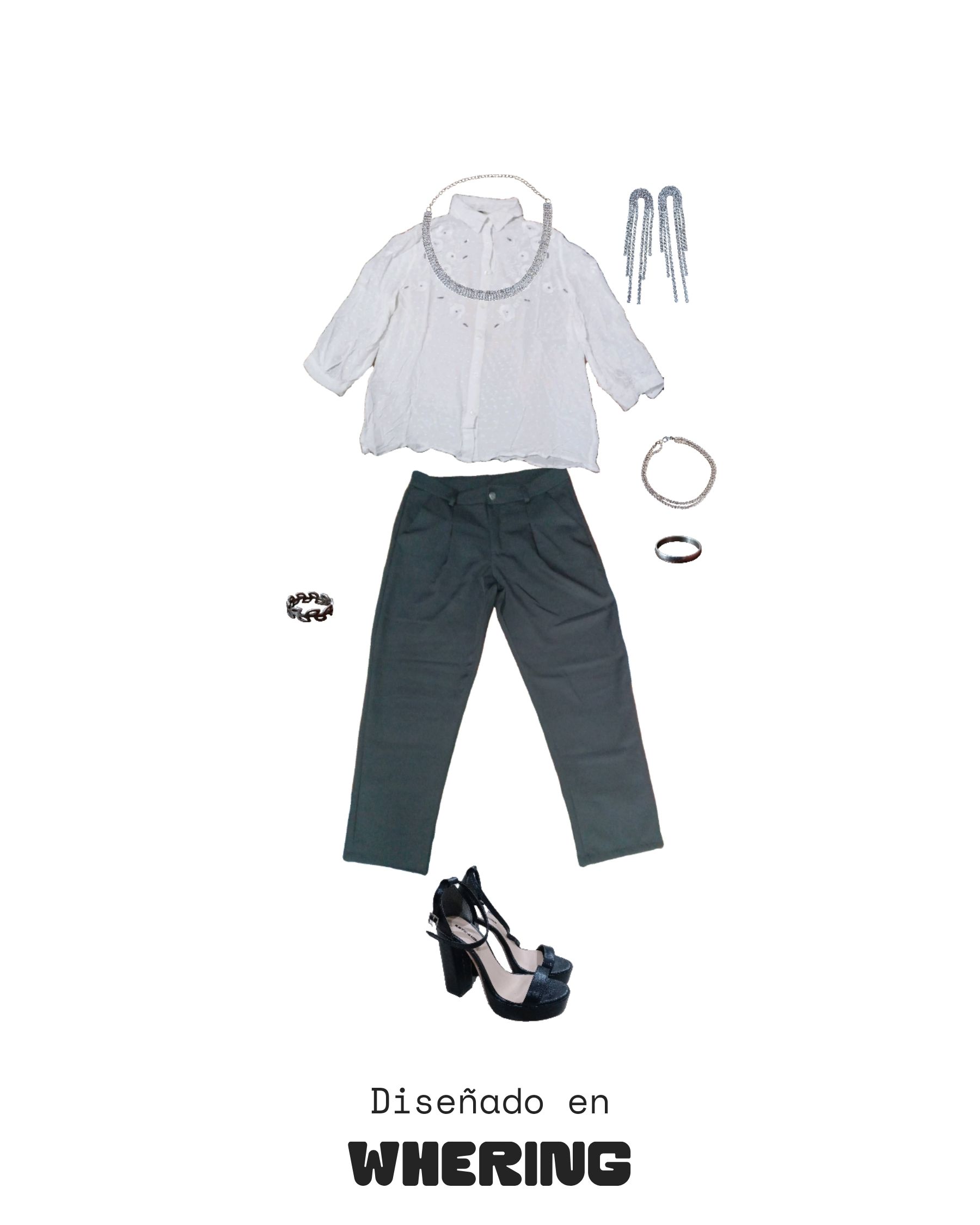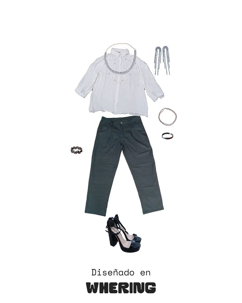Nocturno: Camisa blanca, pantalón sastrero negro, sandalias negras de taco alto, anillos y collar de strass a juego con aros y pulsera.