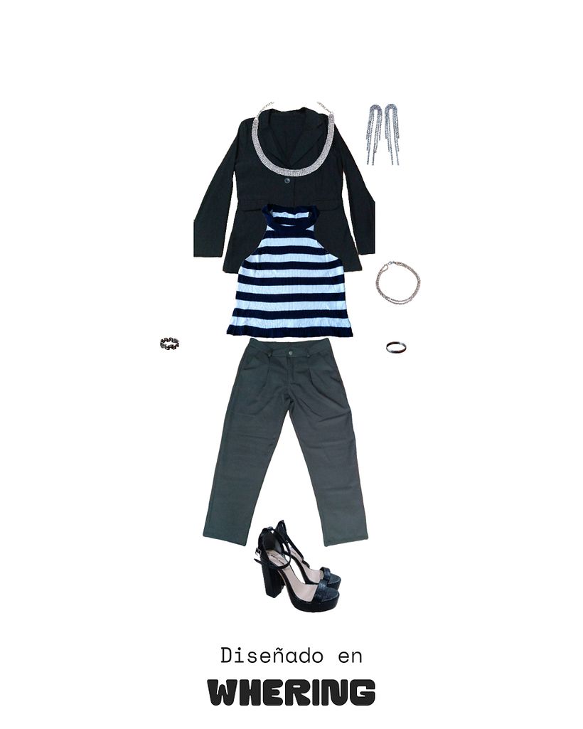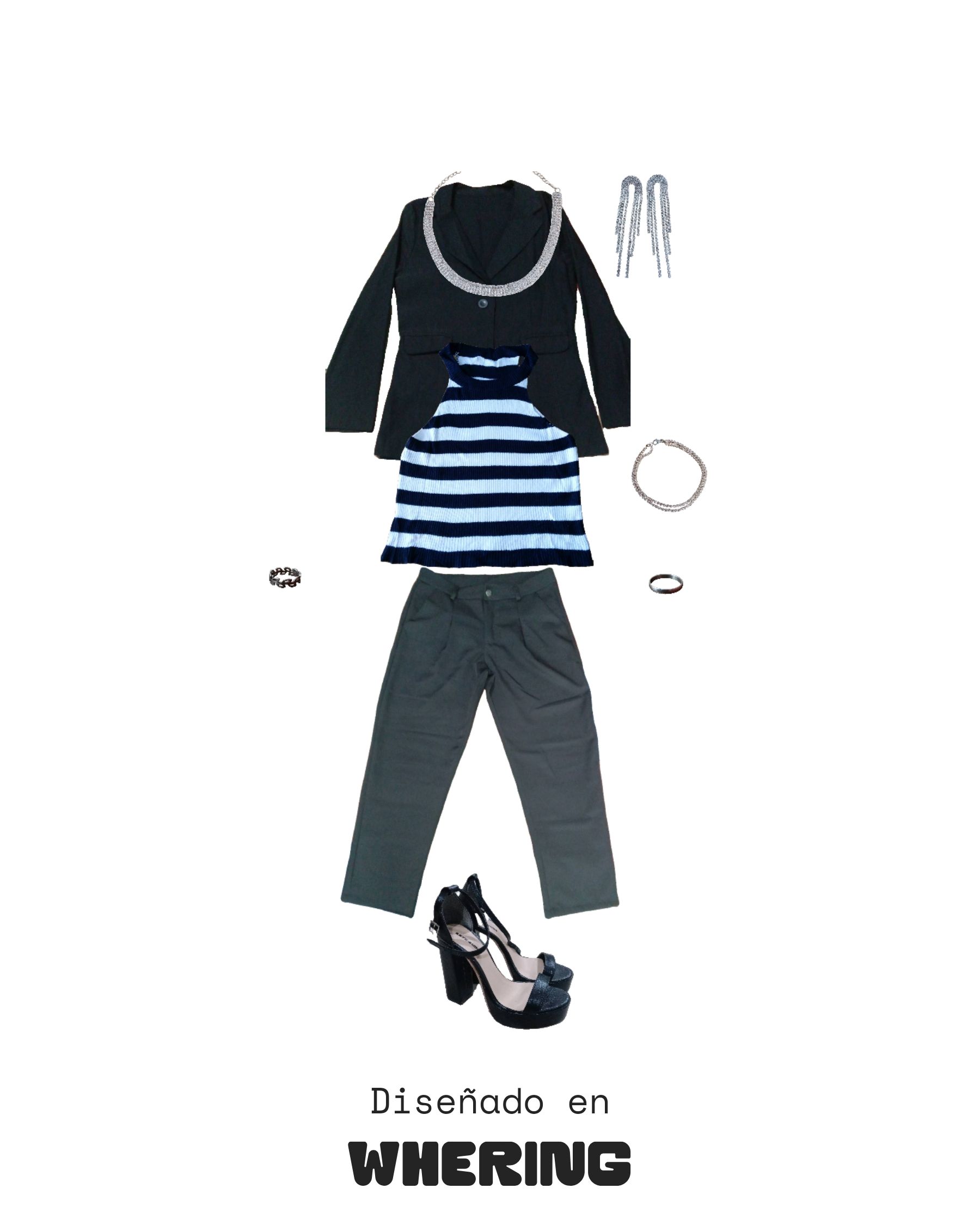 Nocturno: Blazer negro, pantalón sastrero negro, top halter tejido rayado blanco y negro, sandalias negras de taco alto, anillos y collar de strass a juego con aros y pulsera.