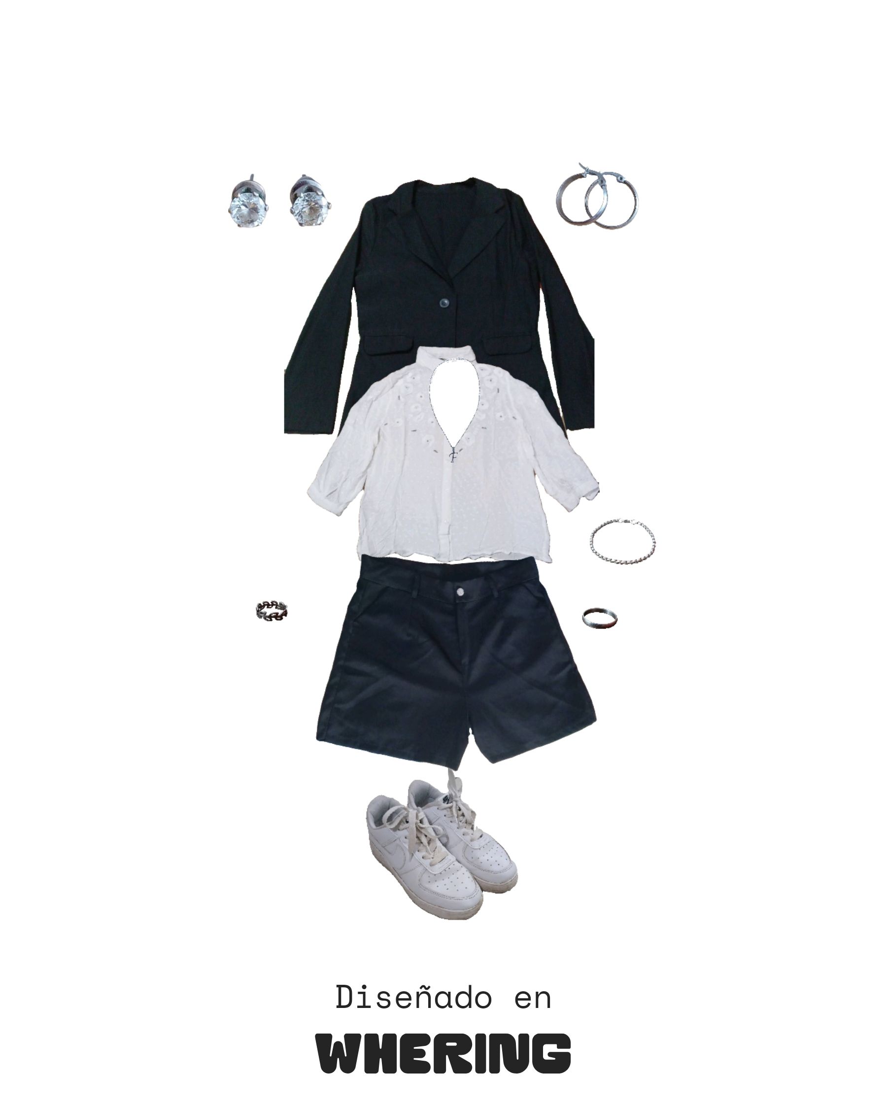 NOcturno: Blazer negro, camisa blanca, short sastrero negro, zapatillas blancas,