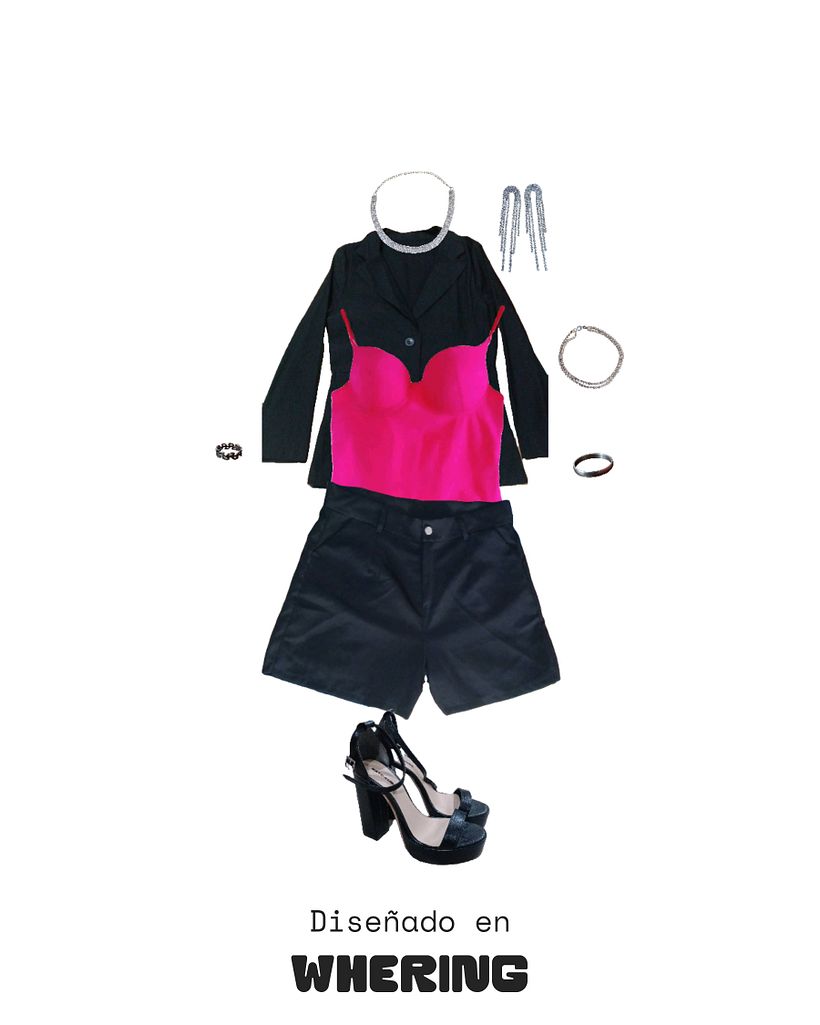 Salida nocturna: Blazer negro, short sastrero negro, enteriza fucsia, sandalias negras de taco alto, anillos y collar de strass a juego con aros y pulsera.