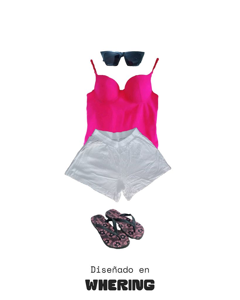 Eventos: Día de playa: Enteriza fucsia, short de lino blanco, ojotas y lentes de sol.