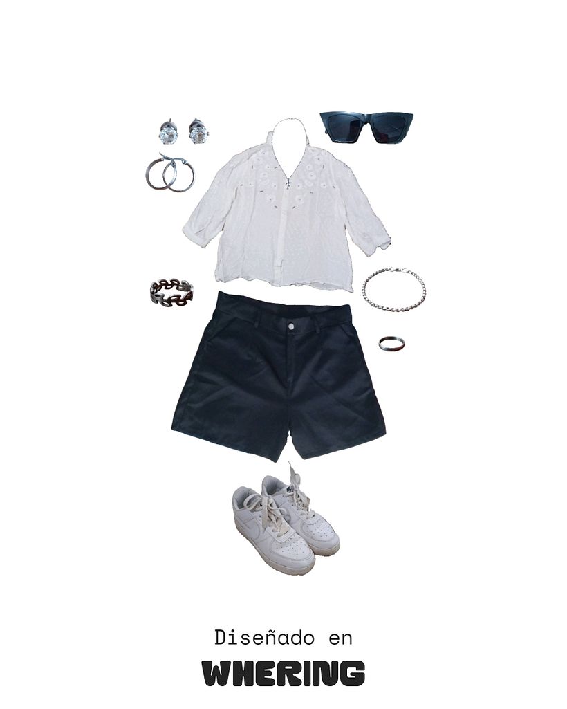 Casual: Camisa Blanca, short sastrero negro, zapatillas blancas, lentes de sol, anillos, aros, pulsera y cadenita.