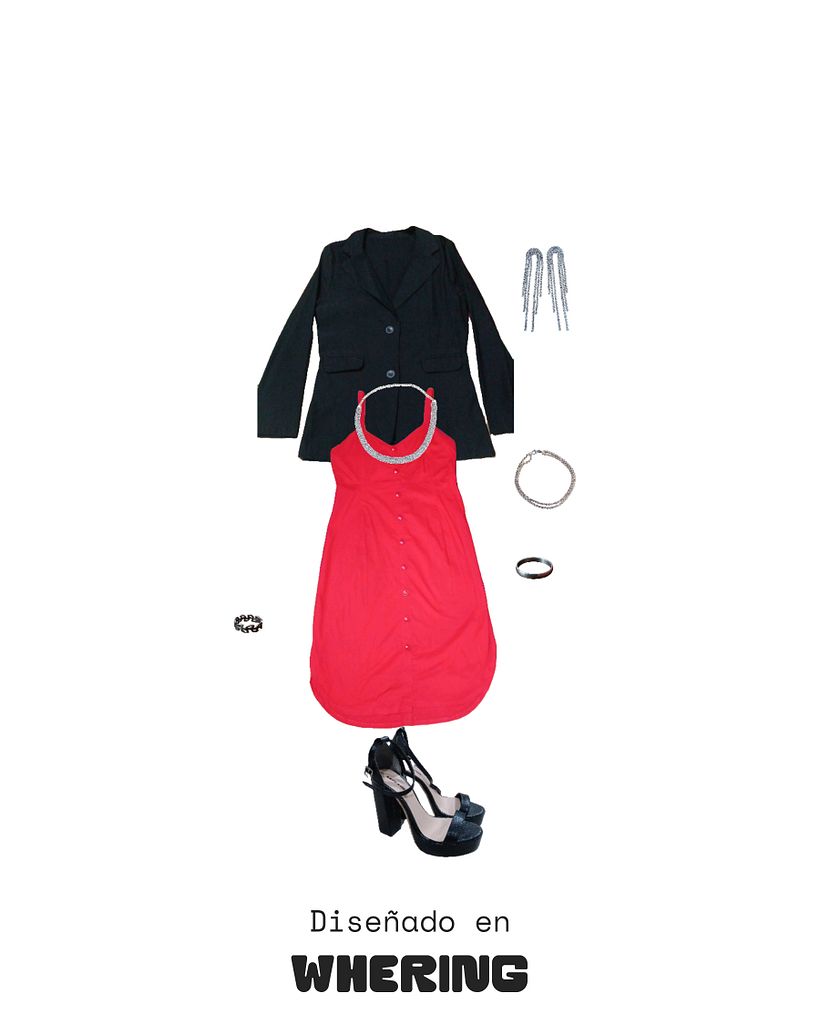 Nocturno: Blazer negro, vestido rojo, sandalias negras de taco alto.