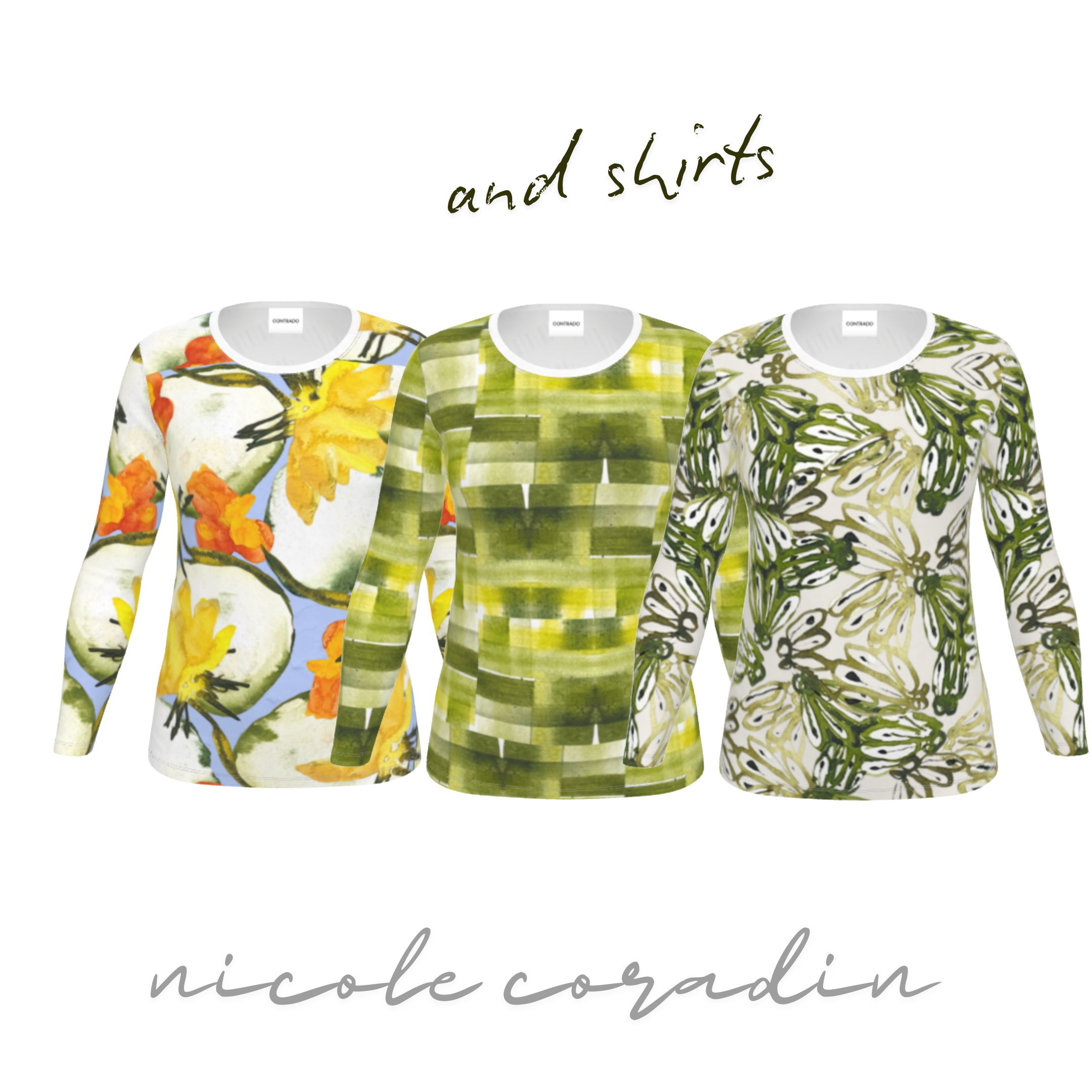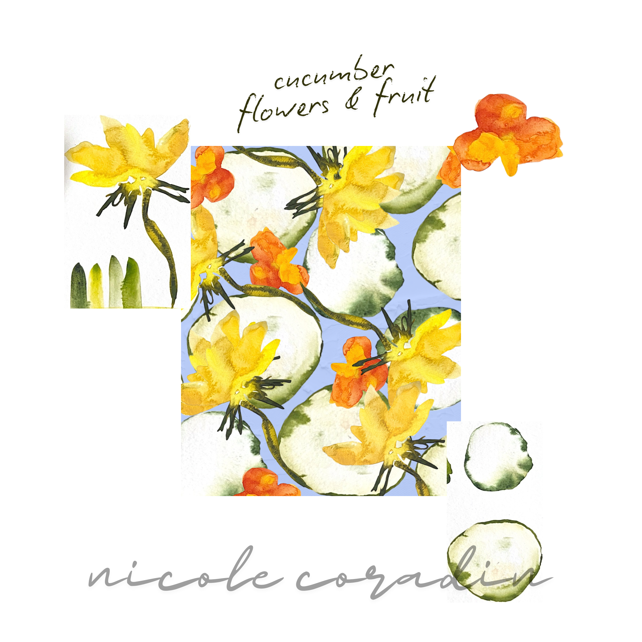 I painted with watercolor to capture the soft forms and natural transparencies that reminded me of cucumber seeds. Then I scanned the paintings and worked digitally in Photoshop, adjusting colors and repeating shapes to create various patterns.