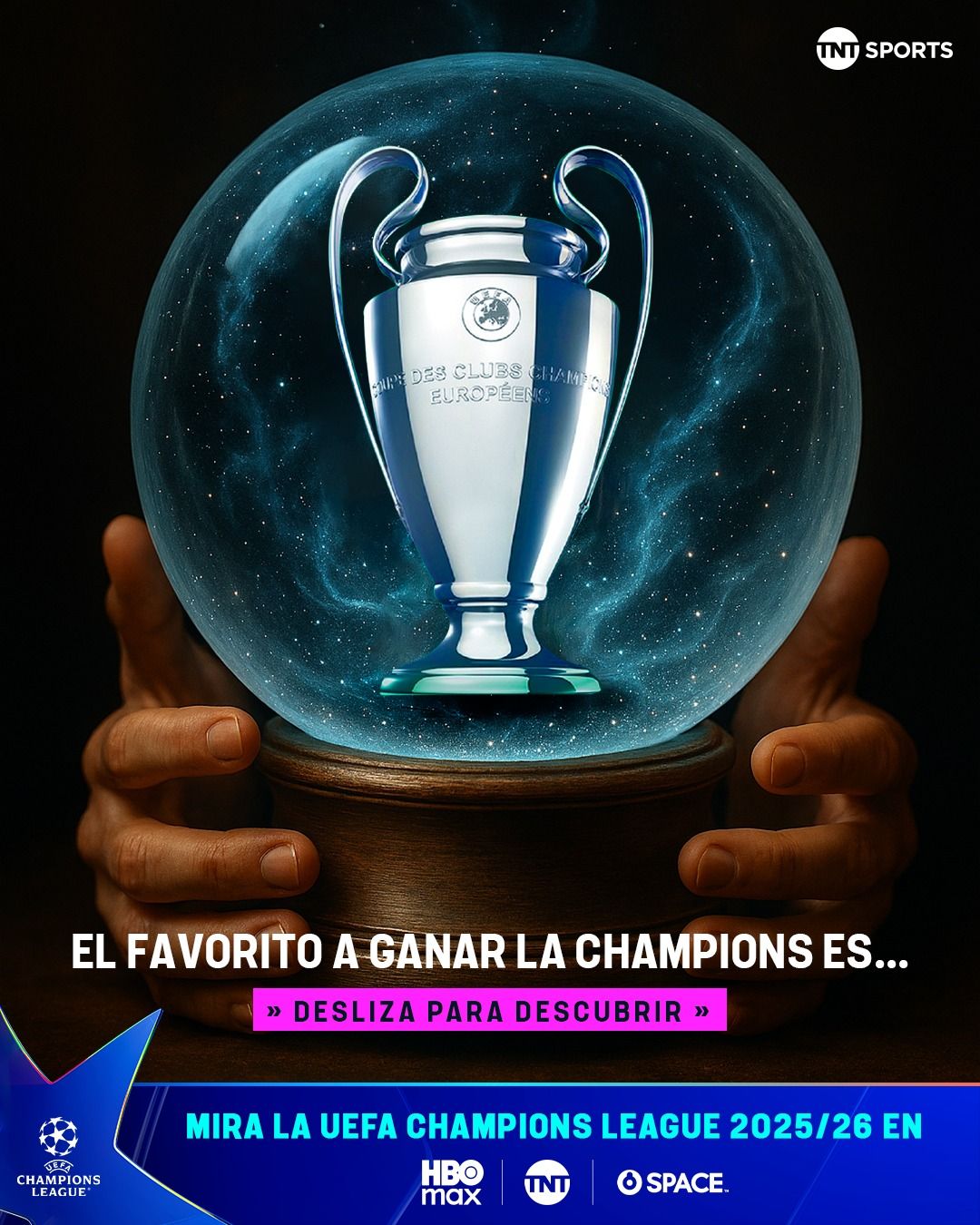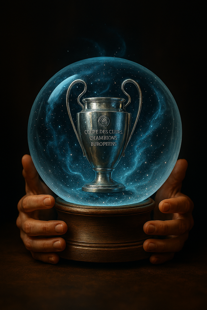 Mi promt fue: Haz una bola de cristal, donde se vea el trofeo de la Champions League, así como una mano sosteniéndolo. Que haya destellos.