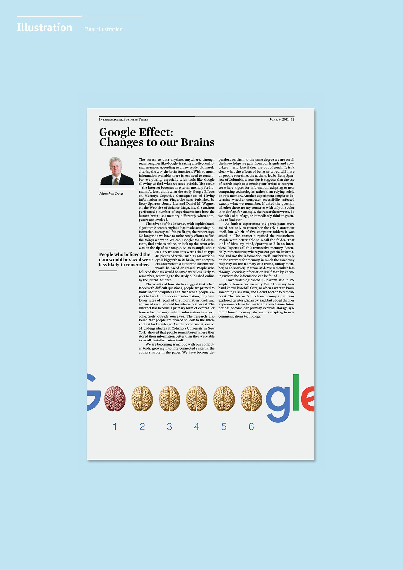 Presentación del proyecto final del curso "Ilustración editorial" en el que he trabajado en el artículo de Johnathan Davis sobre el Google Effect. El artículo habla de como nuestros cerebros están cambiando actualmente sabiendo que gran parte del conocimiento lo podemos conseguir rápida y fácilmente a través de internet y, mas concretamente, a través de Google.