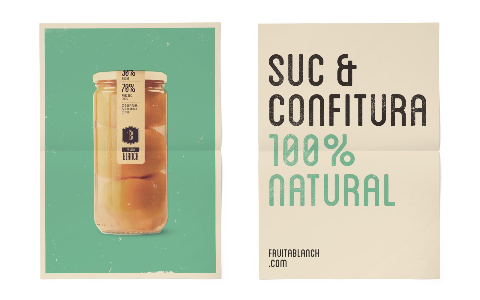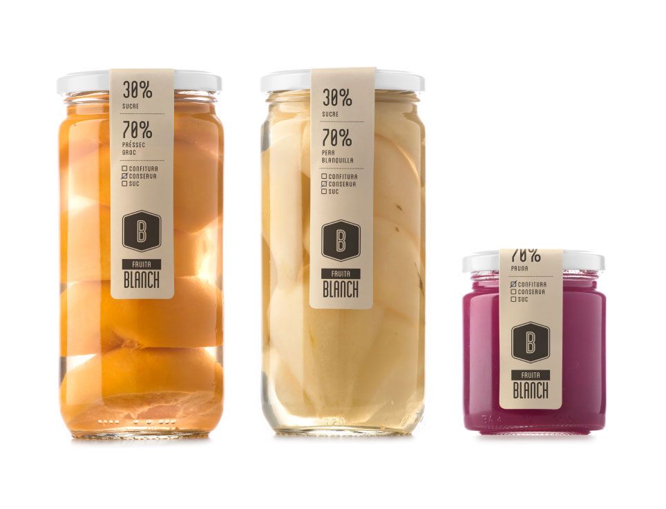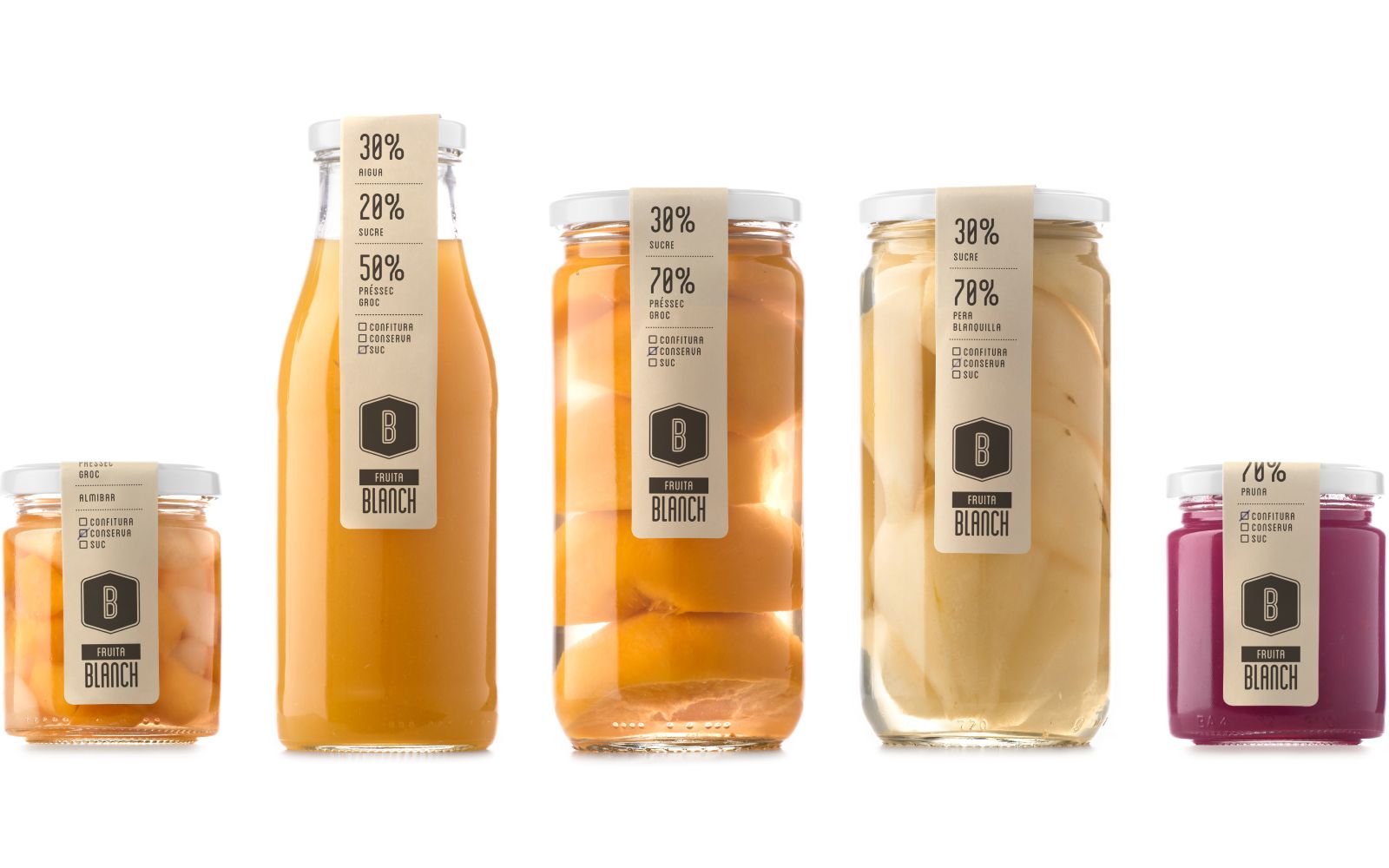 La nueva línea de productos Fruita Blanch quiere dar salida comercial a las conservas caseras que elabora la familia Blanch. Con fruta y productos de cosecha propia, 100% naturales, bajos en azúcares y libres de colorantes y conservantes, nos planteamos una gráfica que quiere ser sincera y transparente con el producto y sus orígenes.