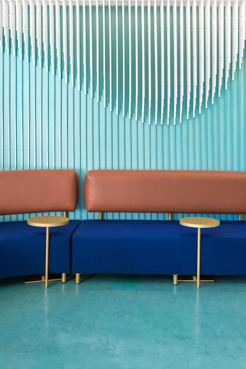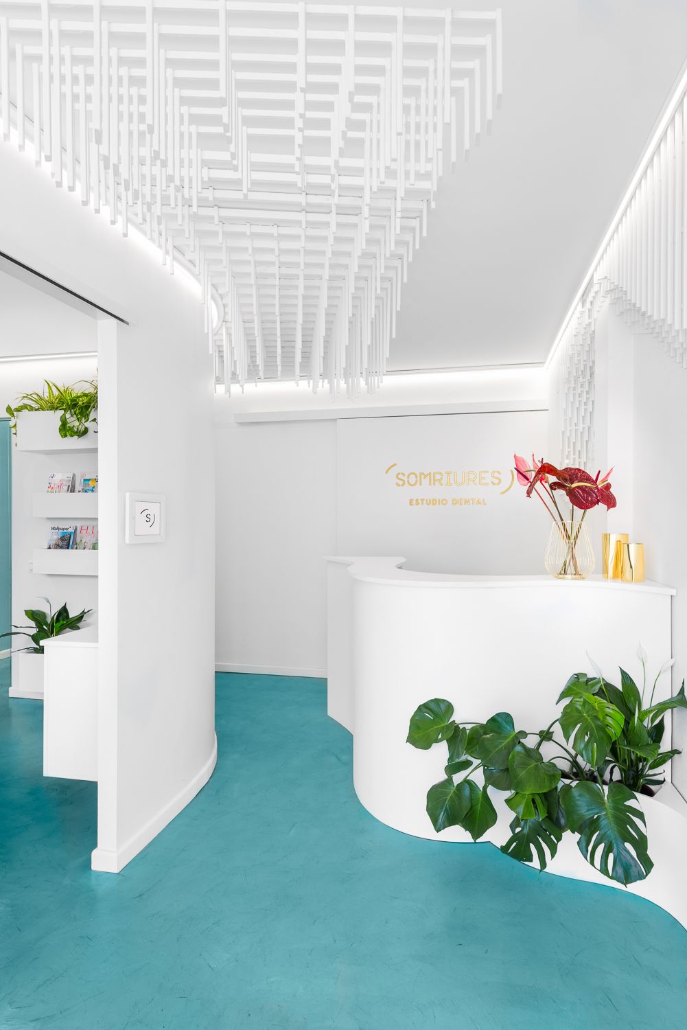 Siendo la especialidad de Somriures la creación de ‘sonrisas bonitas’ el diseño del estudio dental se protagoniza por una escultura de 2884 listones de madera que cuelga desde el techo y también se traslada a algunas de las paredes con el fin de recrear una sonrisa. La escultura además es la guía que lleva al cliente de un punto al otro del espacio. Por otra parte, se ha buscado utilizar colores suaves a través del uso del tono verde turquesa y el blanco, con algún toque de dorado, piel marrón y azul oscuro con el fin de crear un contraste sofisticado. Además, en cada momento se han utilizado formas orgánicas en las distintas piezas de mobiliario hechas a medida que compaginan perfectamente con el concepto de la sonrisa bonita.