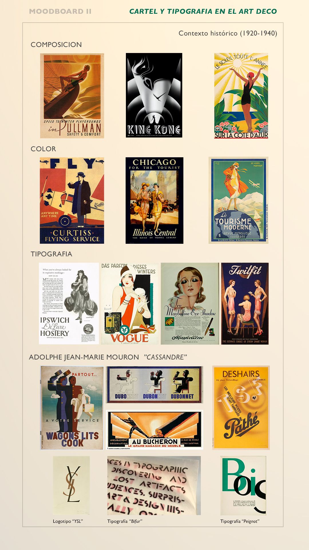 El estilo escogido para trabajar es el Art Deco; que a pesar de que fue considerado más un estilo decorativo internacional que un movimiento de Diseño (Paris años 20), emergió con gran fuerza y es que fue muy popular debido a sus asociaciones con la vida de ensueño Hollywoodiense.