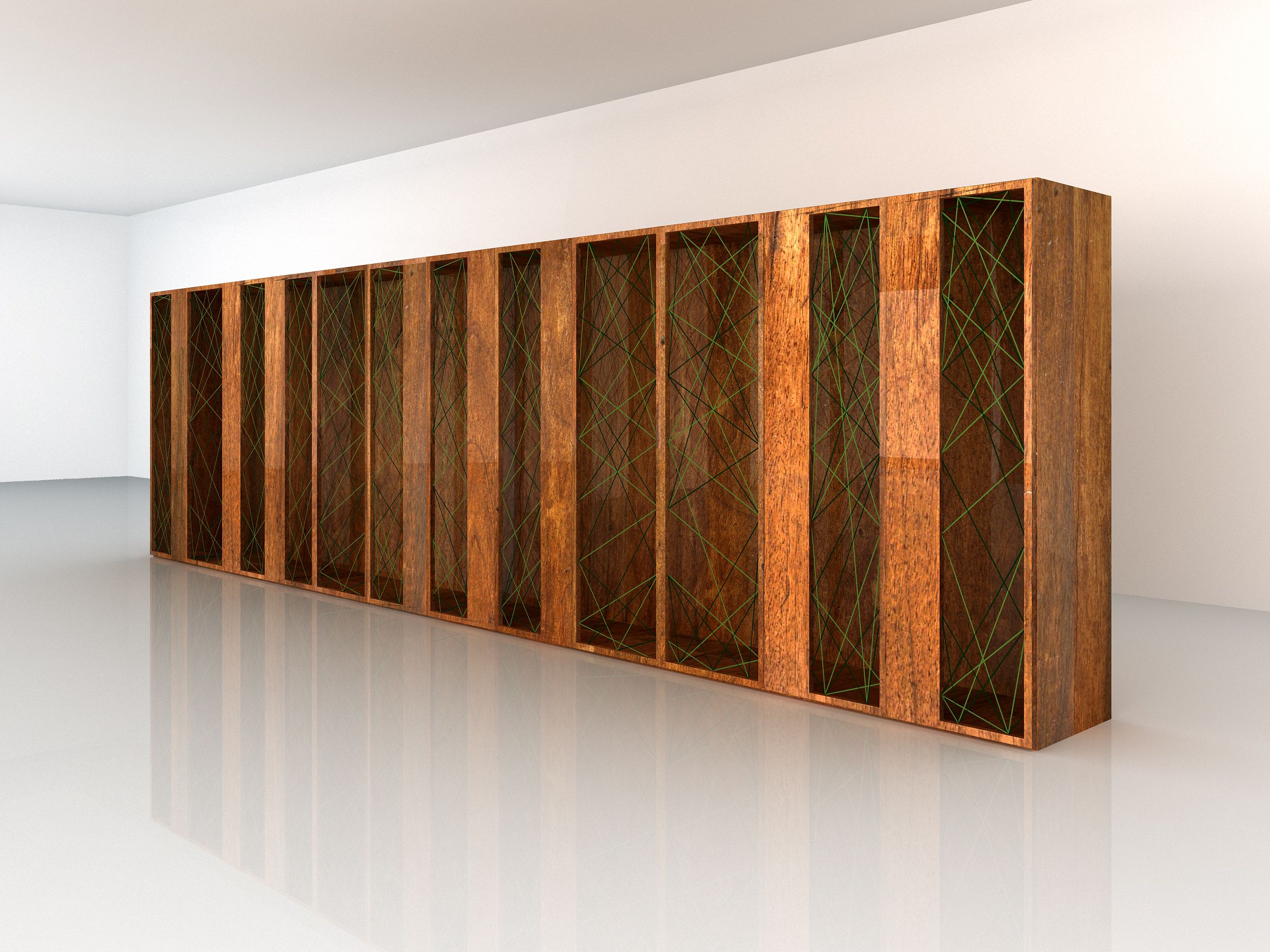 El macizo central diseñado de hilo y madera recrea el tamiz de la luz que se da en la naturaleza. La dualidad de materiales represeta la suavidad –hilo- y la dureza –madera- que es al mismo tiempo el contraste que ofrece las hojas y los troncos de los árboles. Por este motivo, el macizo se convierte en la pieza principal del proyecto.