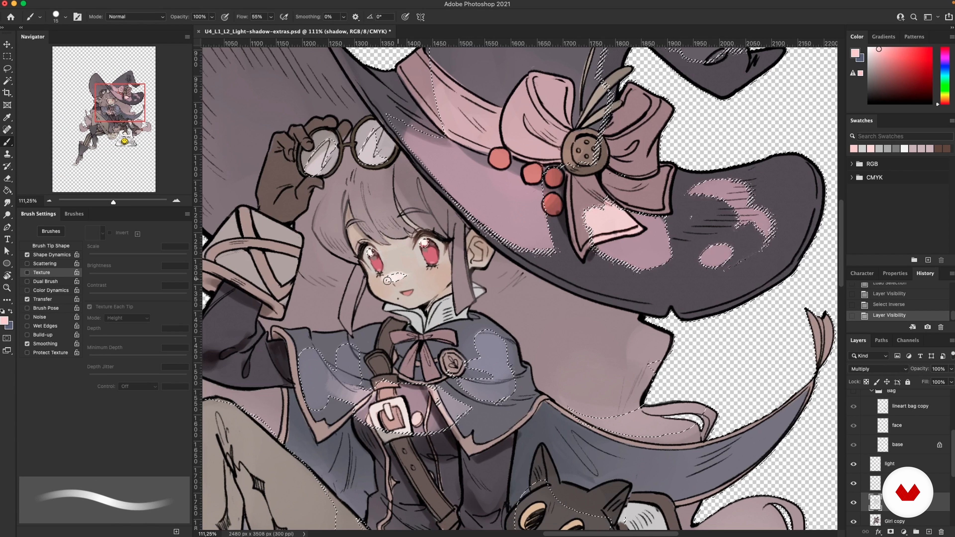 “În această lecție vom vedea partea mea preferată la ilustrare. Vom adăuga lumini și umbre. Vom face retușuri dacă este necesar și astfel vom considera aproape finalizată ilustrația noastră. Este momentul să facem ultimele retușuri desenului nostru. Aici putem face unele corecții cu unealta de transformare sau liquify dacă este necesar. Odată ce suntem mulțumiți de rezultat. vom adăuga lumini și umbre. Ceva ce fac eu. dar nu funcționează pentru toată lumea. este să unesc toate straturile. În acest caz. de exemplu. al personajului meu. fac o copie și totul rămâne împreună pentru a face aceste...”