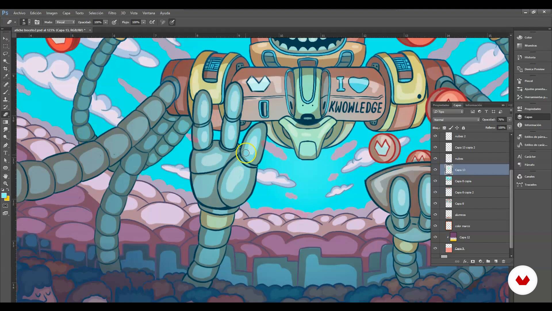 “Efect și fundal În această lecție, voi împărtăși cu voi câteva sfaturi despre Photoshop. astfel încât ilustrația ta să fie mai izbitoare și mai impresionantă. Privind robotul acum, cred că este destul de izbitor, dar aș vrea, brusc, să reduc opacitatea robotului, dar aș vrea totuși să rămân în prim-plan sigla Domestika. Deci, pentru asta mergem la stratul robot. Partea bună este că culoarea robotului este separată. Deci, dacă reduc opacitatea totul devine gri, dar totul devine gri în același timp. Deci, asta va fi secundar. Dar și asta. Deci, ce pot face E prima dată când se duplică asta, n...”
