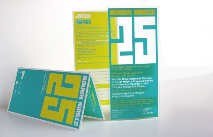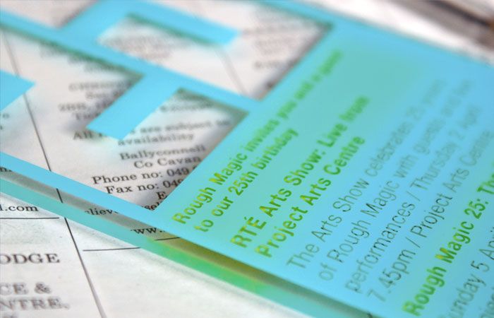 Rough Magic Theatre Company is one of the leading independent theatre companies in Ireland, regularly performing at Dublin Project Arts Centre and tours its work in Ireland, UK and beyond. To celebrate the 25th Anniversary I've designed flyer, poster and a very unique invitation printed on transparent 3mm PVC.
