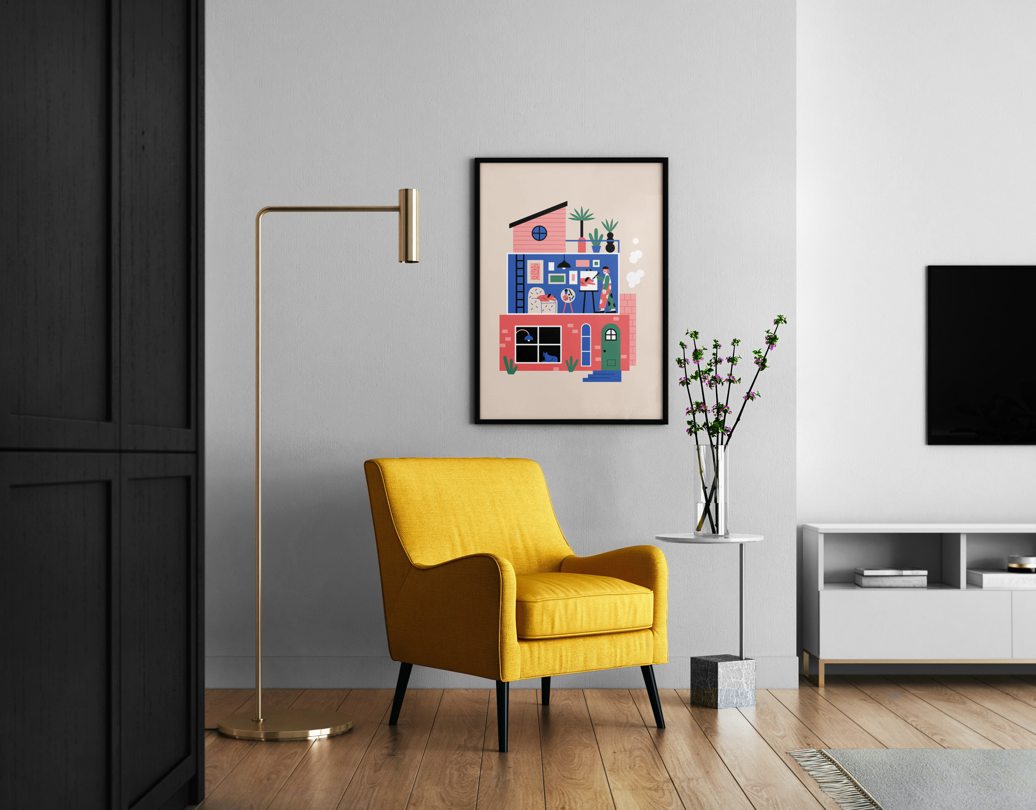 La casa de mi vecino es una exposición digital colaborativa organizada por Senior Fernández donde distintos artistas representaron casas de vecinos imaginarios. Nuestra ilustración fue sobre la casa de una pintora que le gusta retratar a sus mascotas.