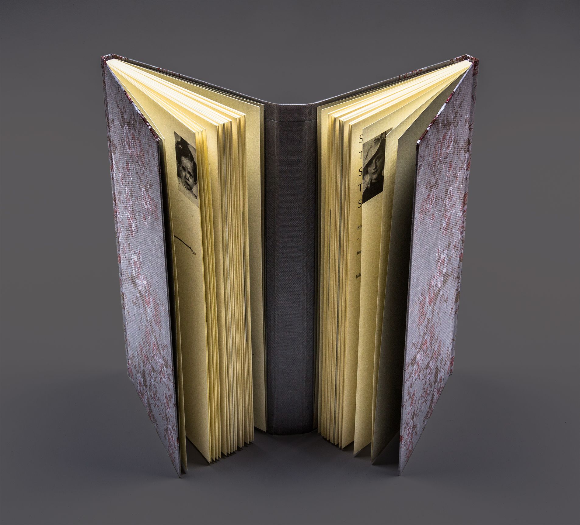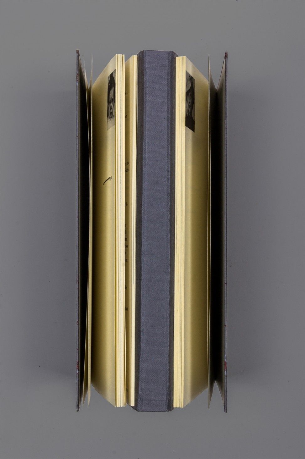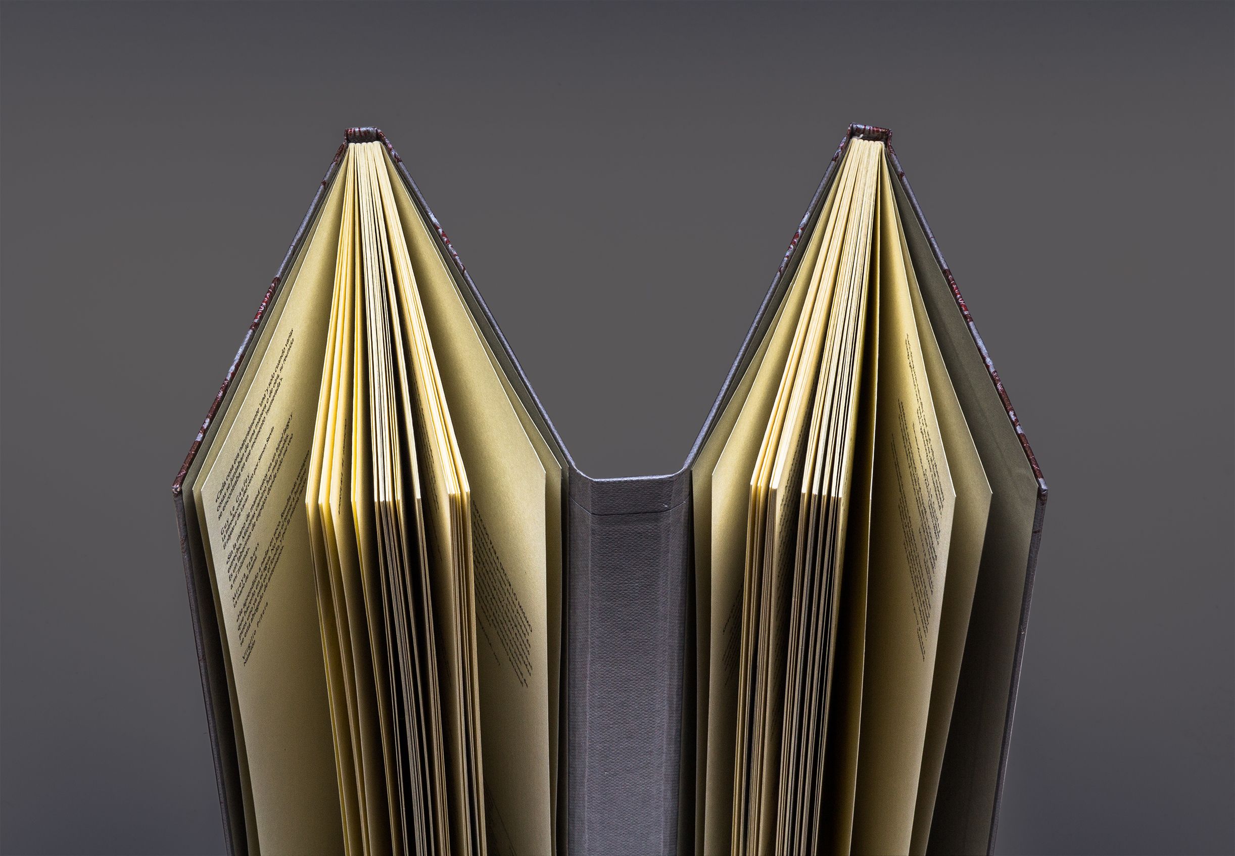 This book is based on a 1765 bible. It has a third spine in the middle in order to read both volumes at the same time or individually. This edition has two volumes in a box, cloth bound, three square spines, with 3 Pantone inks & text blocks in Laid paper. 150 copies. Printed and bound at Ex Libris Press. 2017.