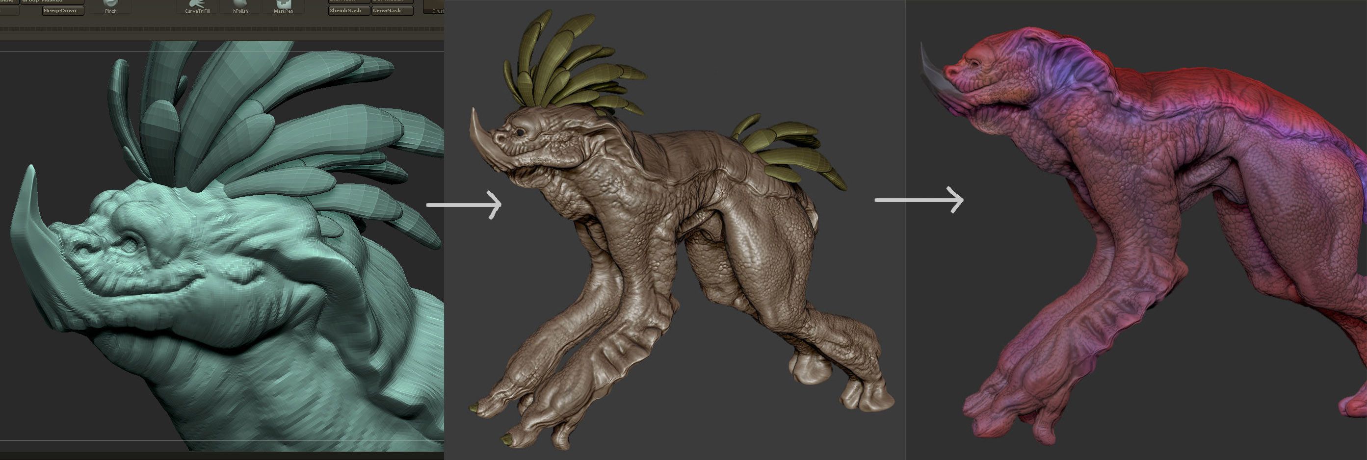 Modeling and Sculpting all in Zbrush. Handpainted and colored in Zbrush too. Uv's done in Maya. Fill texture in Substance Painter. Rendered in Marmoset. Composite in Photoshop. All baked on low poly.
