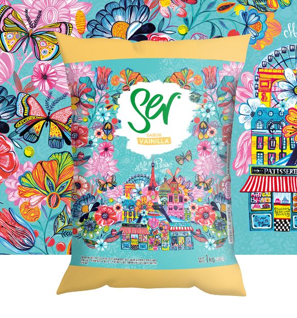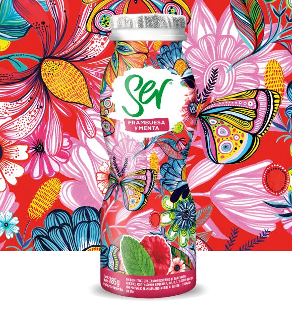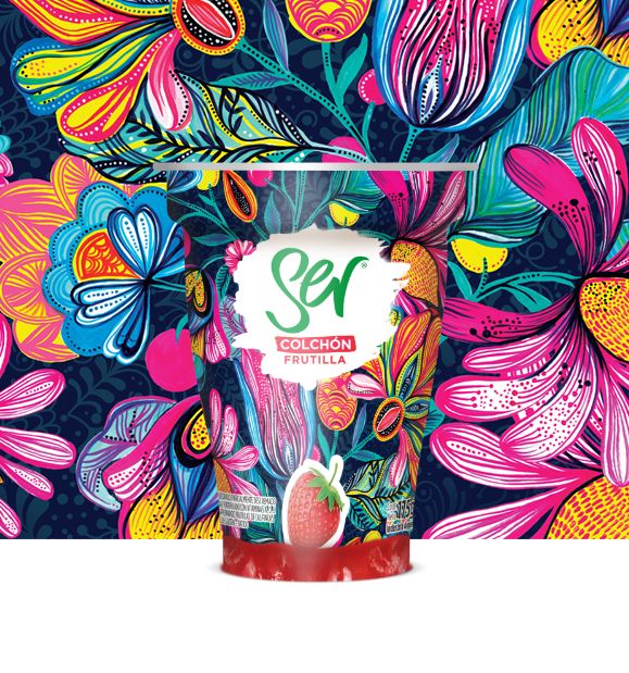 Ilustraciones y patterns para la marca Danone. Colección de packs de Yogures. Cuando la ilustración llega a las góndolas para vestir todo de color.