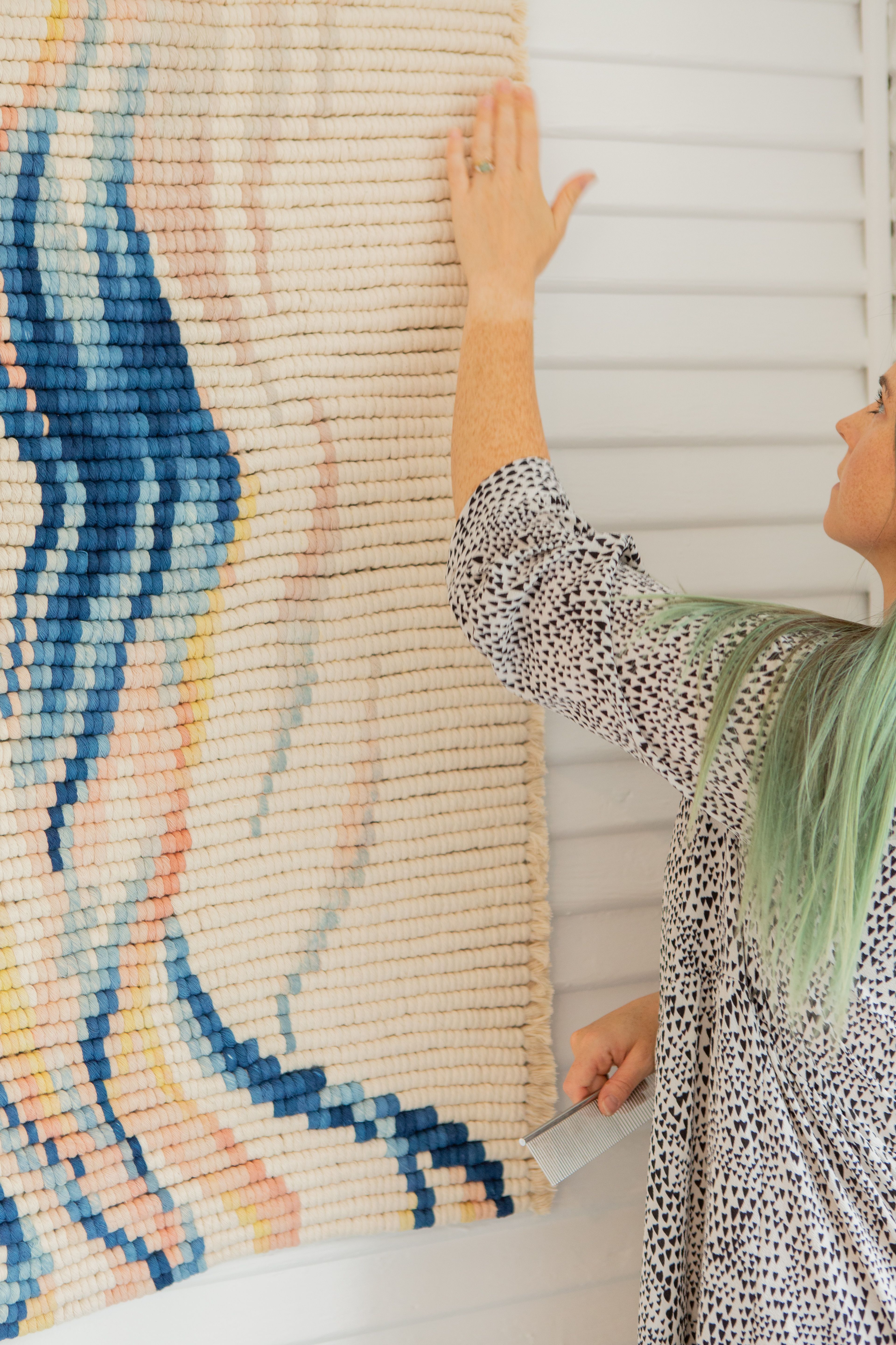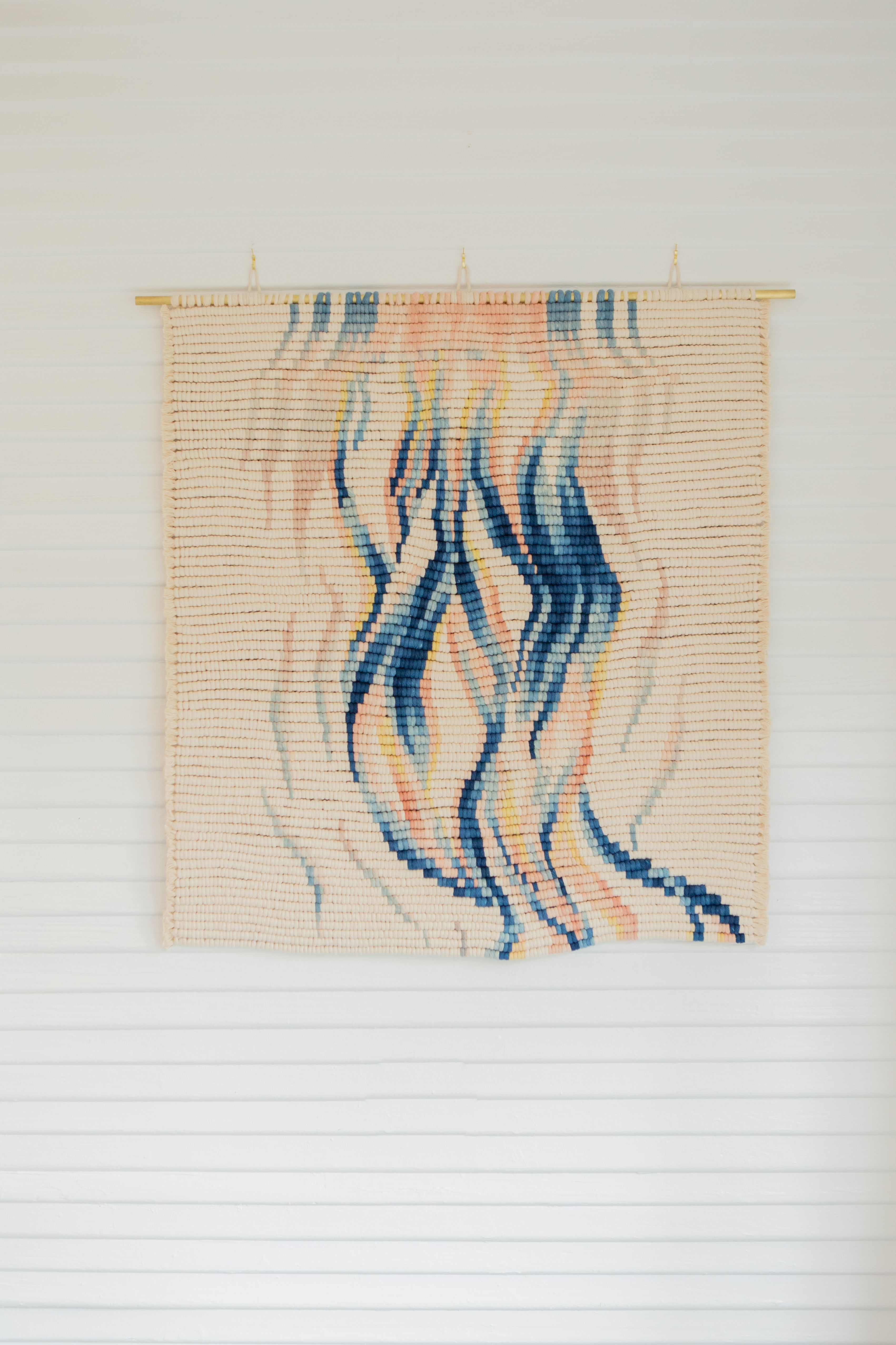 The colors come from my way of dyeing my cotton string to create these transitional color gradients that are meant to keep your eye travelling along the piece. That paired with the meandering strings really makes this river dance!