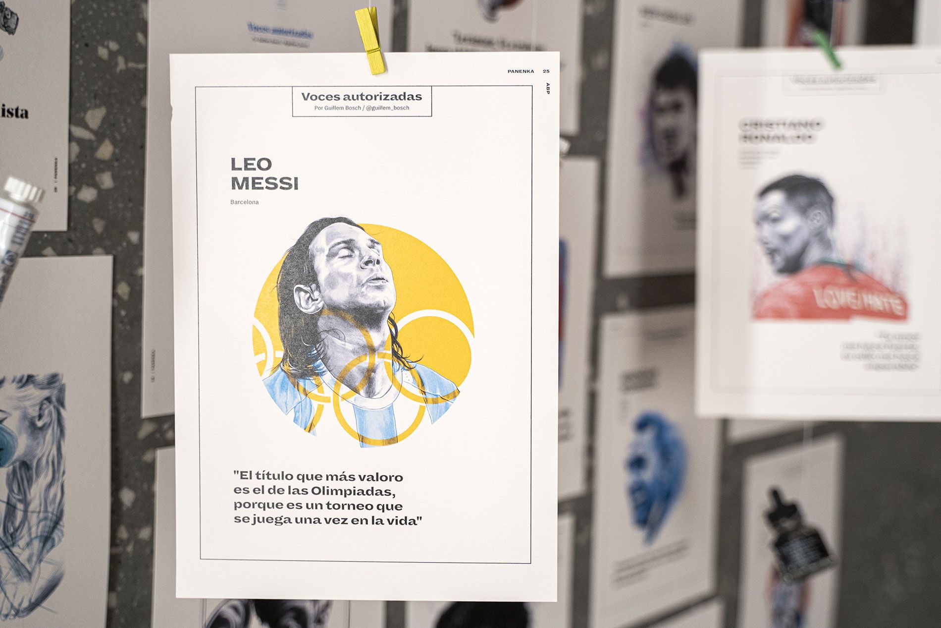 In this exhibition, we aim to delve into the history of the most global sport through its protagonists, legendary players and coaches, brought to life through my illustrations and Panenka's texts. Their most famous quotes are just the excuse to explore a series of figures who, over time, have become not only idols for fans but also pop culture icons: Alexia Putellas, Leo Messi, Cristiano Ronaldo, Megan Rapinoe, Pep Guardiola, Thierry Henry, Gianluiggi Buffon, Jorge Valdano, Ronaldo Nazario, Cholo Simeone, Mia Hamm, Zinedine Zidane, Dani Alves, Iker Casillas, and many more. They will play ball in this exhibition where football and art join hands to celebrate the ease with which this sport creates global idols and generational icons.