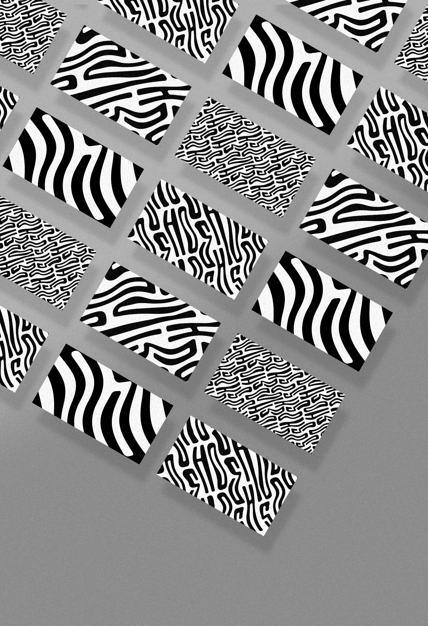 Removing the edges of the logo, it was possible to develop some 'rapports' so that shapes can be used as patterns. The apparently disordered repetition of the characters in the font developed for Visual Identity form abstract textures that can be worked in different proportions, as shown in the image above.