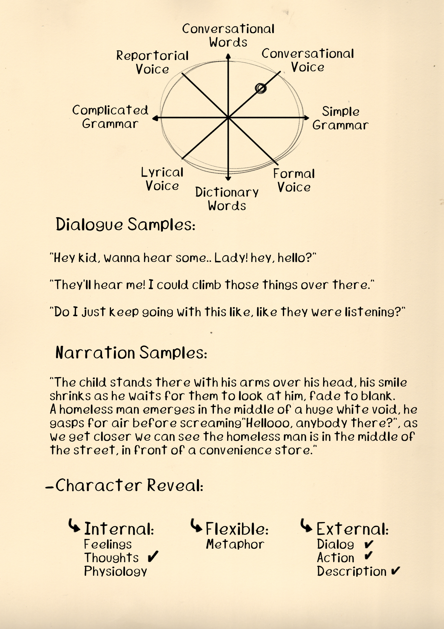 Ah, o întrebare foarte, foarte bună. Cred că o parte din asta depinde de mecanismele artei vizuale pe care le poți folosi. Cred că e în regulă să-i arăți gândurile în formă scrisă - MAI ALES pentru că în forma de bandă desenată, arta în sine poate fi foarte vie și activă... cum ar fi panoul care poate fi plin de mici povești sau fragmente vizuale care creează o profunzime ce susține reflecțiile sale. O greșeală pe care o fac scriitorii timpurii este să ai un personaj singur într-o cameră care meditează la lucruri. Când este pur și simplu scris, este mult mai greu să creezi tensiune narativă atunci când este doar un tip într-o cameră care gândește. Așadar, o modalitate prin care schimbăm lucrurile este să oferim personajului ceva de . Chiar dacă face aceleași reflecții, dar acum este într-o mașină și se duce singur undeva. Câștigăm ceva oferindu-i personajului contrapondere . Din nou, avantajul formatului tău este că poți arăta un tip în casa lui gândindu-se, iar acest lucru poate fi interesant pentru că poți crea vizual mișcare, contrast, contraste, personaje etc. Poate că e acasă și meditează, iar oala lui cu paste fierbe la suprafață și sunt o mulțime de bibelouri de privit. Practic, ai mai multă libertate de a împărtăși reflecții, pentru că poți crea și scene interesante.