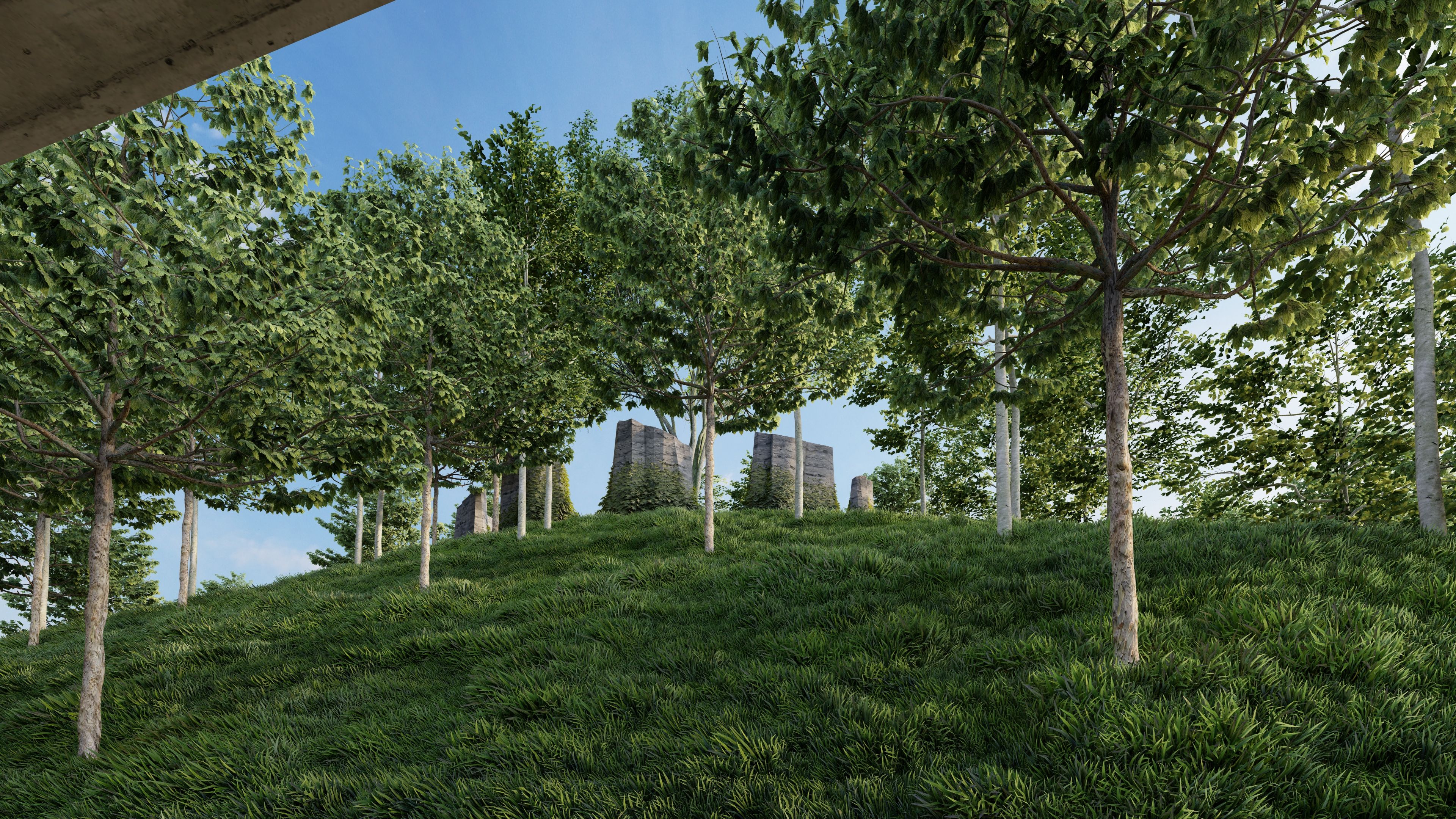 În punctul focal, este plantat un copac artificial cu o formă inspirată de coarnele de cerb,