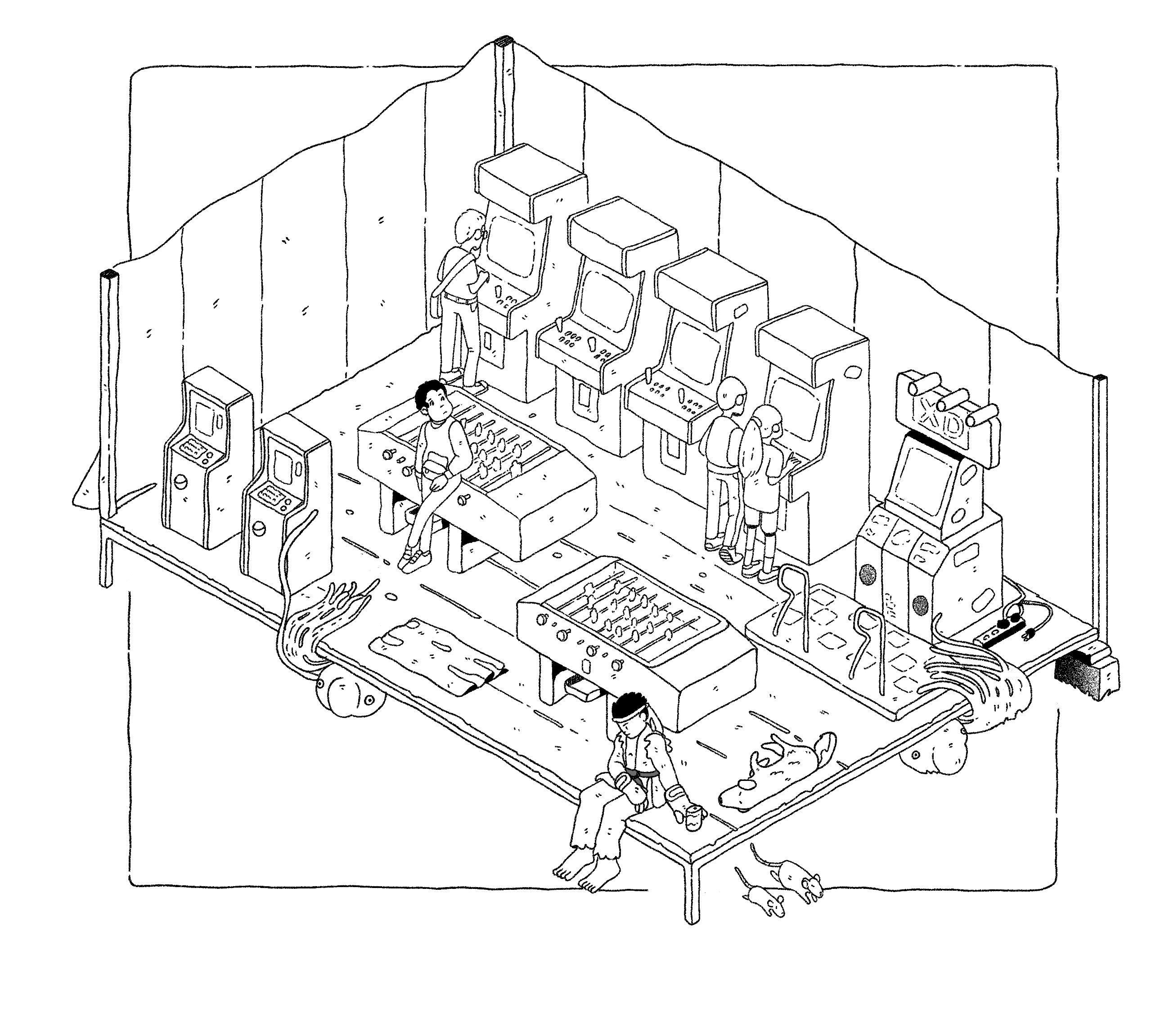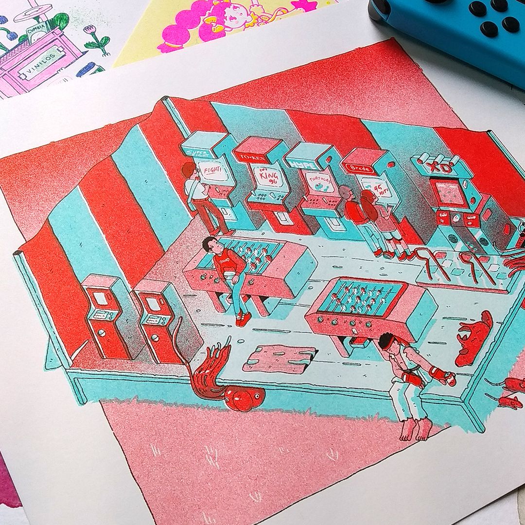Colaboré con S.A.R.A. un taller de risografía en la Ciudad de México en una antología de comercios ambulantes que se publicó en 2021. Hice esta ilustración de un negocio de arcades o "maquinitas" que son tradicionales de las ferias ambulantes que hay en algunas ciudades de México. Después de hacer la versión para risografía decidí que tenía que hacerla en acuarela también.