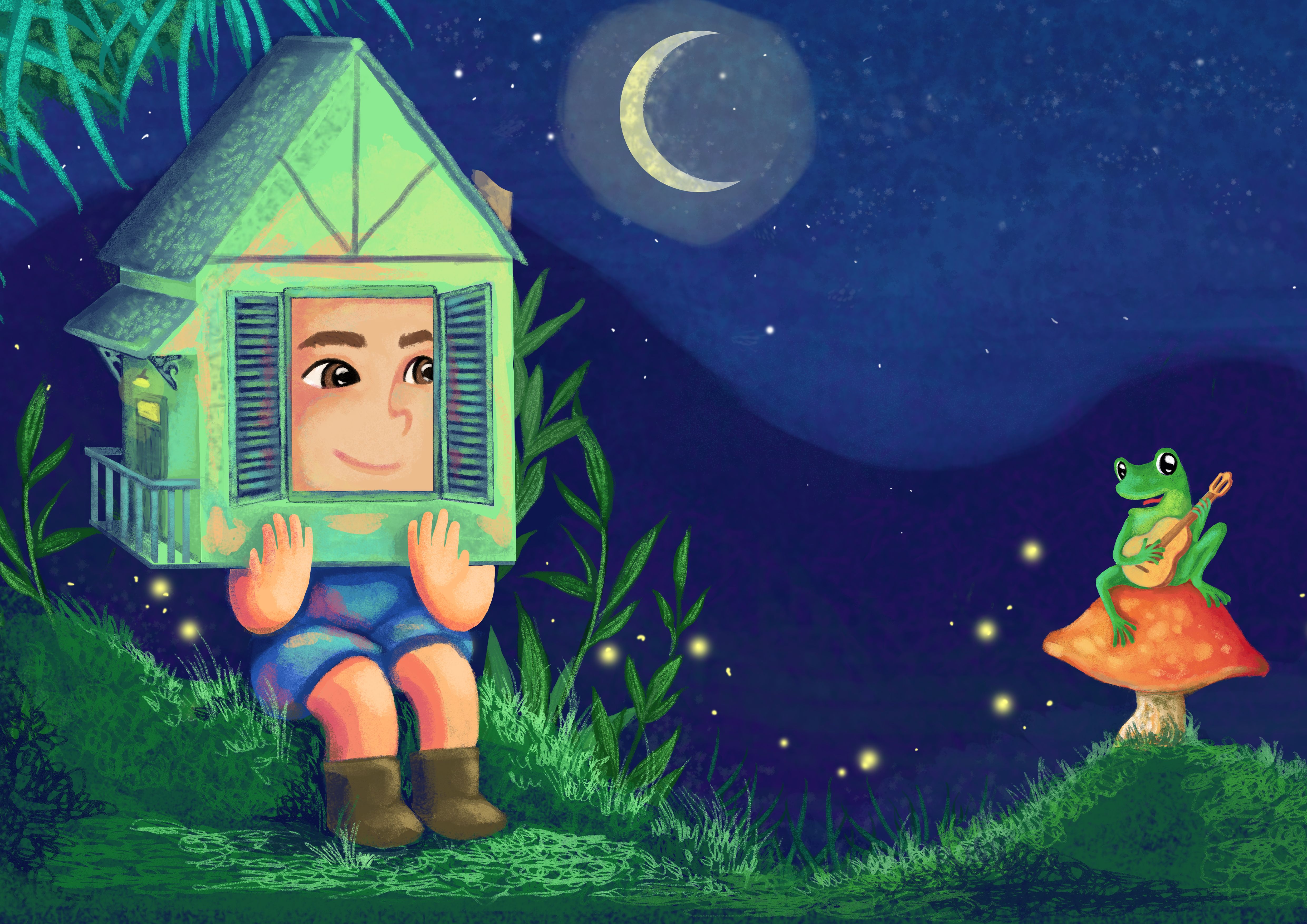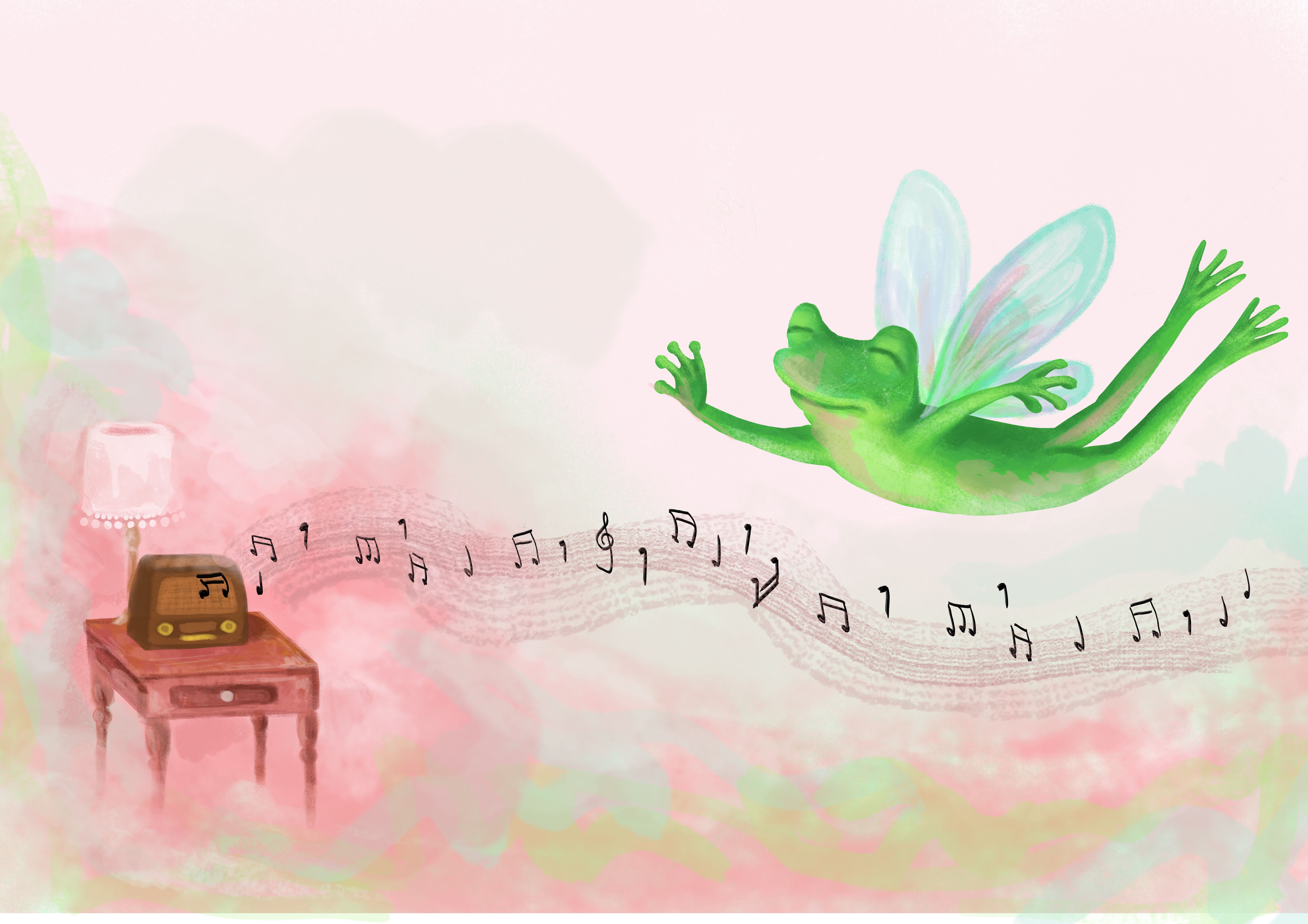 El texto cuenta la historia de un vinculo entre una rana y un niño que vive cerca de su laguna. En la primera imagen el niño "espía" a la rana. Por eso la idea de dibujarlo escondido desde su casa y sentirla pequeña ante la escena que observa y escucha, ya que la rana está cantando. En la segunda imagen subida la rana escucha la música que sale de la radio, en la paleta de color y la metáfora de estar flotando/volando se infiere las sensaciones que le causan las melodías.