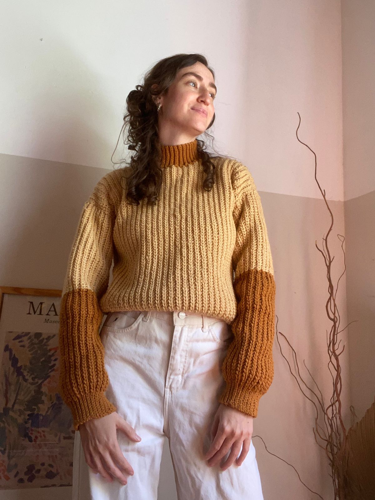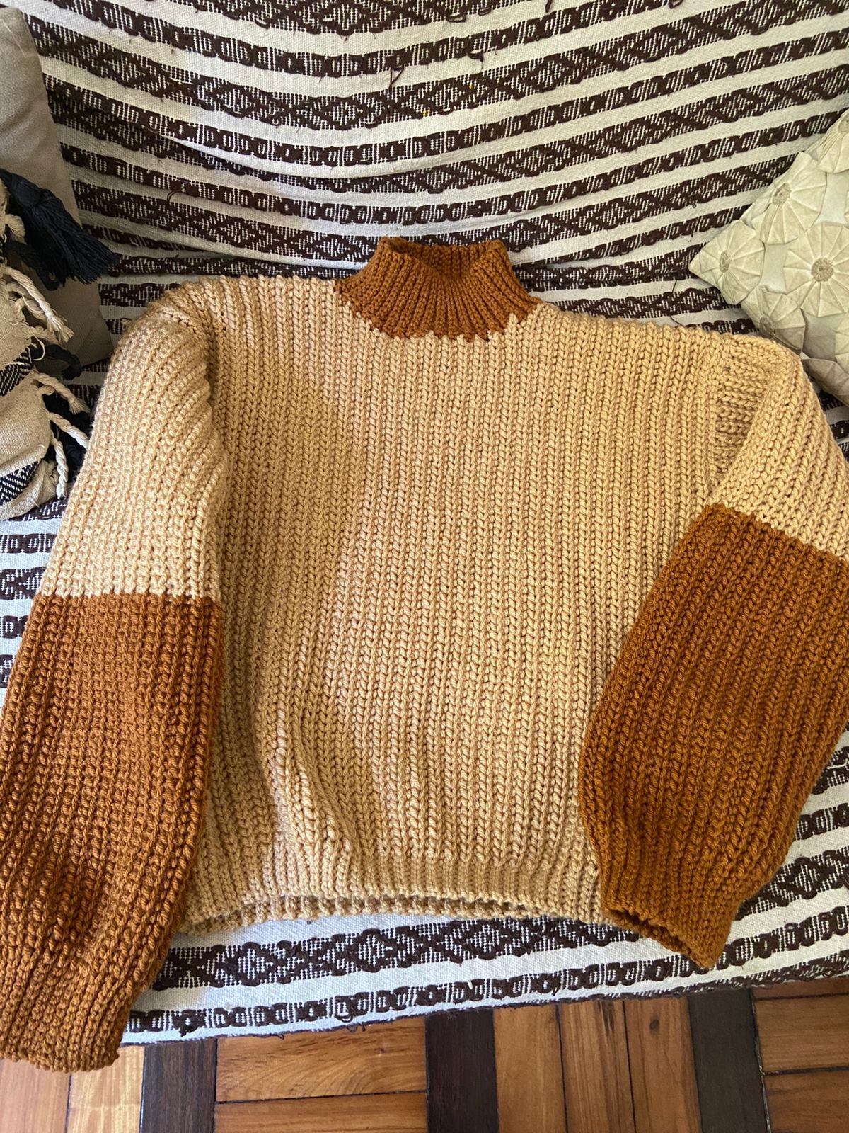 Utilizei a lã Classic Pull da Circulo nas cores areia e caramelo, e uma agulha 5mm.