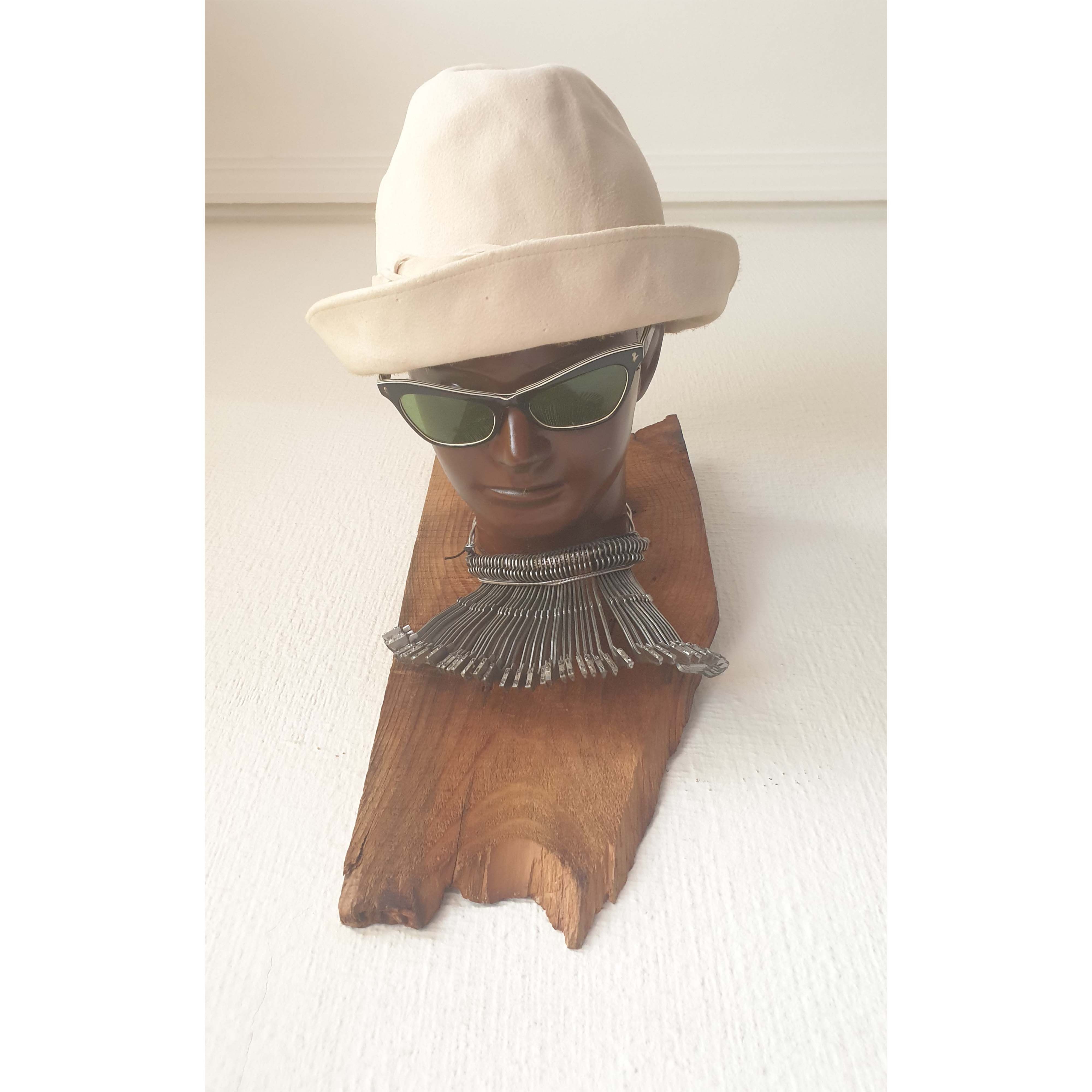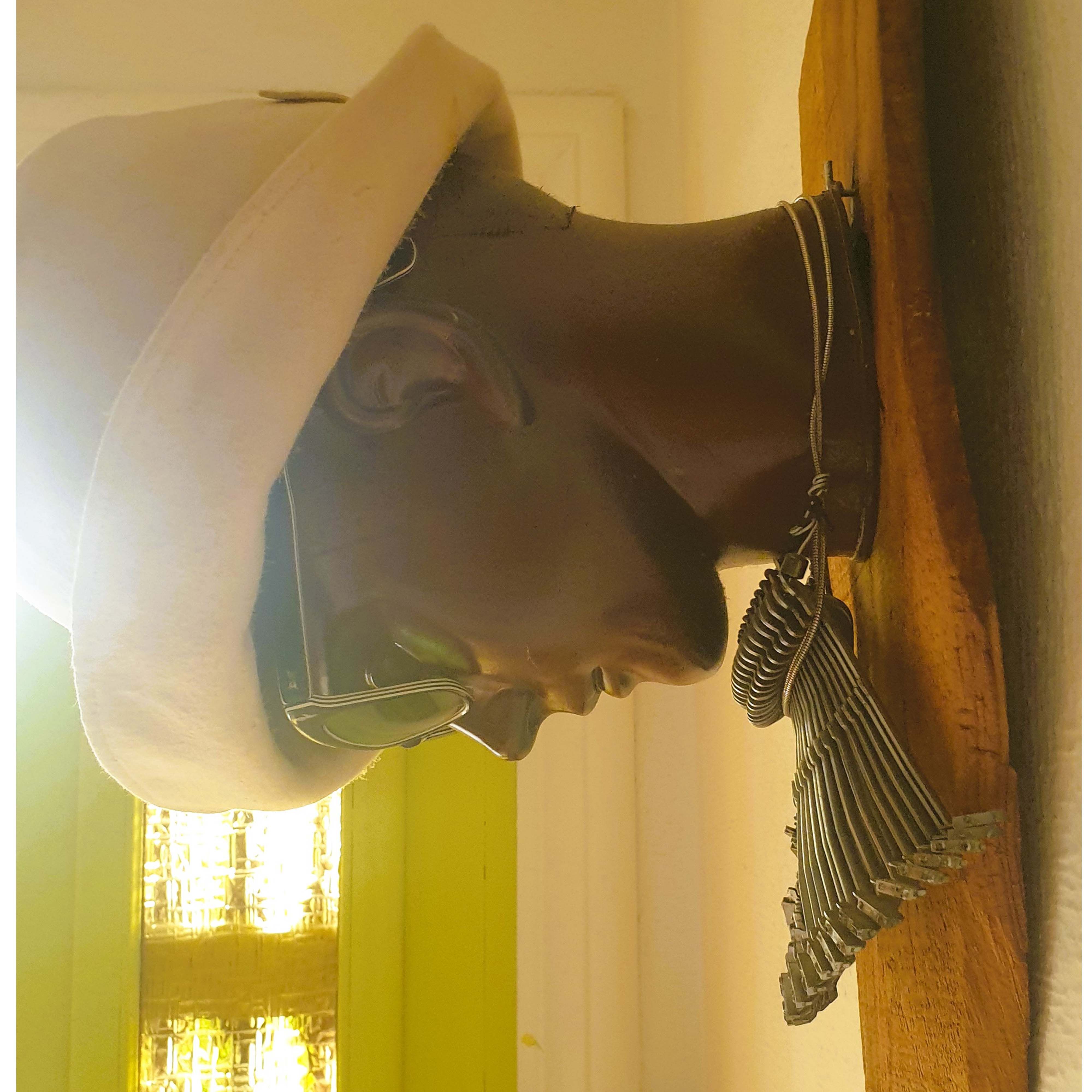 Gargantilla con palas de máquina de escribir y cadena metálicas; busto de plástico; gafas y sombrero; tabla de madera.
