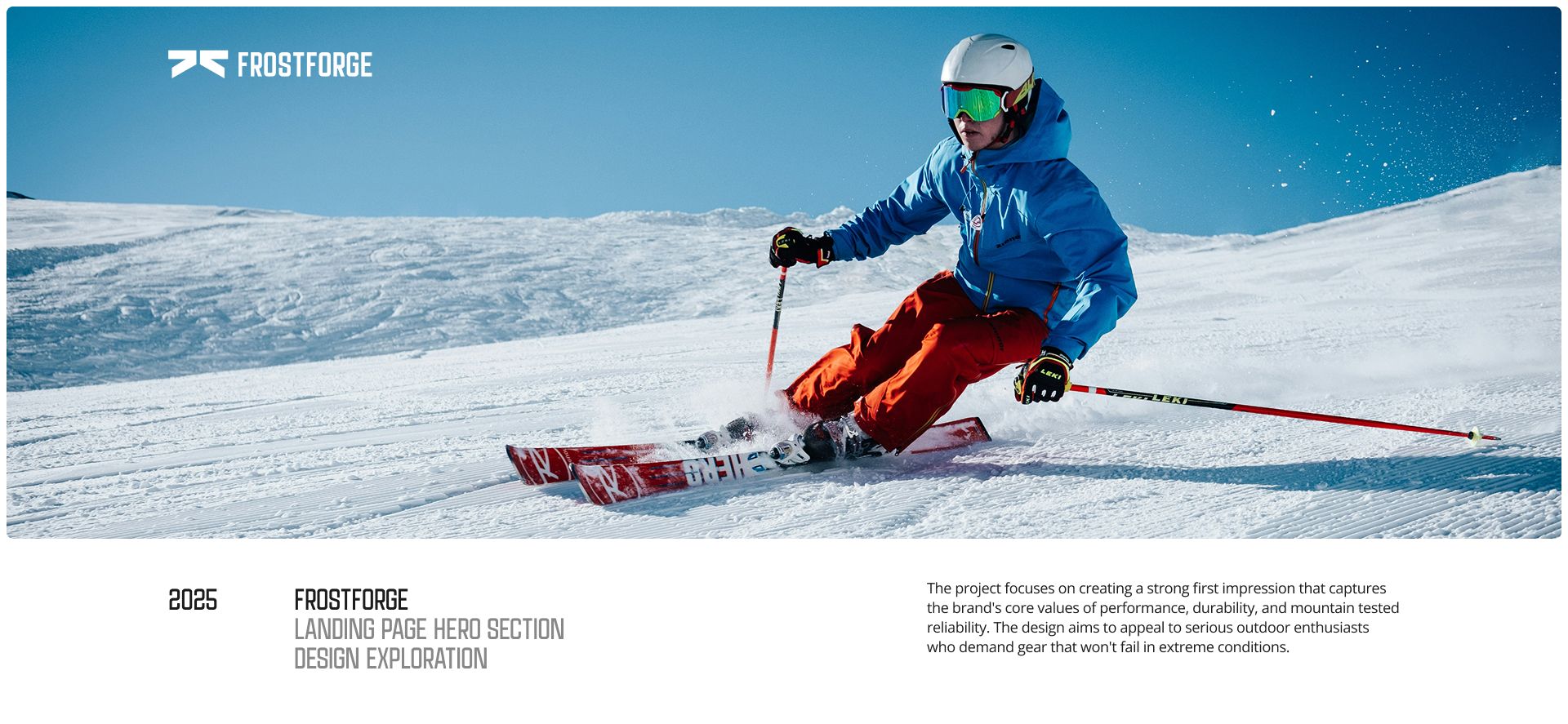 This is a landing page hero section design exploration for FrostForge, a conceptual snow adventure wear brand. The project focuses on creating a strong first impression that captures the brand's core values of performance, durability, and mountain-tested reliability. The design aims to appeal to serious outdoor enthusiasts who demand gear that won't fail in extreme conditions.