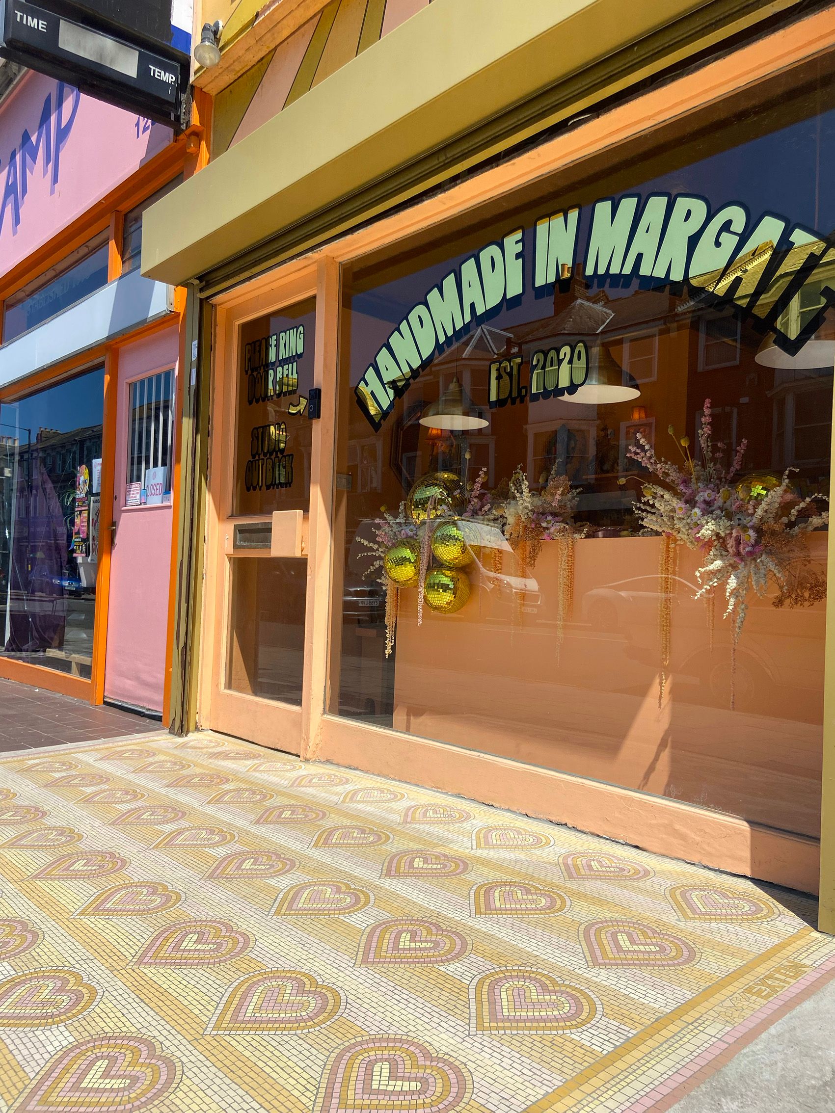 In 2022 I was commissioned to design and make a mosaic pavement for Reo Jewels in Margate. This was my biggest commission to date, and also my first floor/pavement mosaic. The process for making a floor mosaic of this scale is more involved than when making smaller wall-based mosaics, and it proved a real challenge. I worked out the process as I went along, with plenty of guidance from London School of Mosaic, where I was still studying at the time.