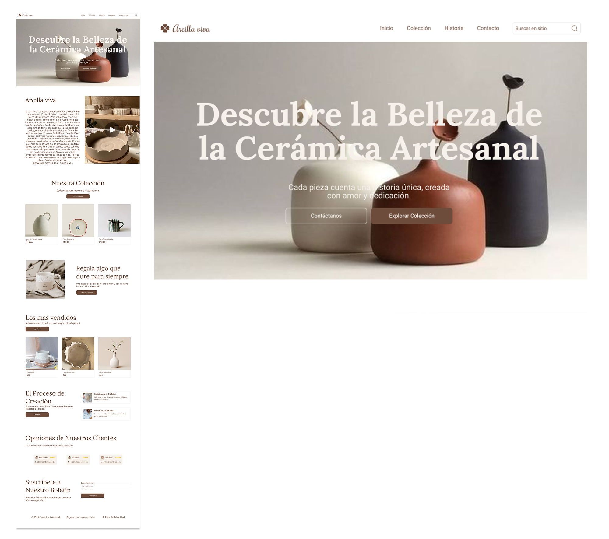 La landing page presenta visualmente las piezas de cerámica con fotografías limpias y estéticas, transmite la esencia de lo hecho a mano, utilizando una paleta de colores cálidos y naturales, cuenta la historia de la marca y su proceso artesanal, invita a explorar la colección o realizar pedidos personalizados e incluye un llamado a la acción claro, enfocado en la conversión (venta, consulta o encargo).