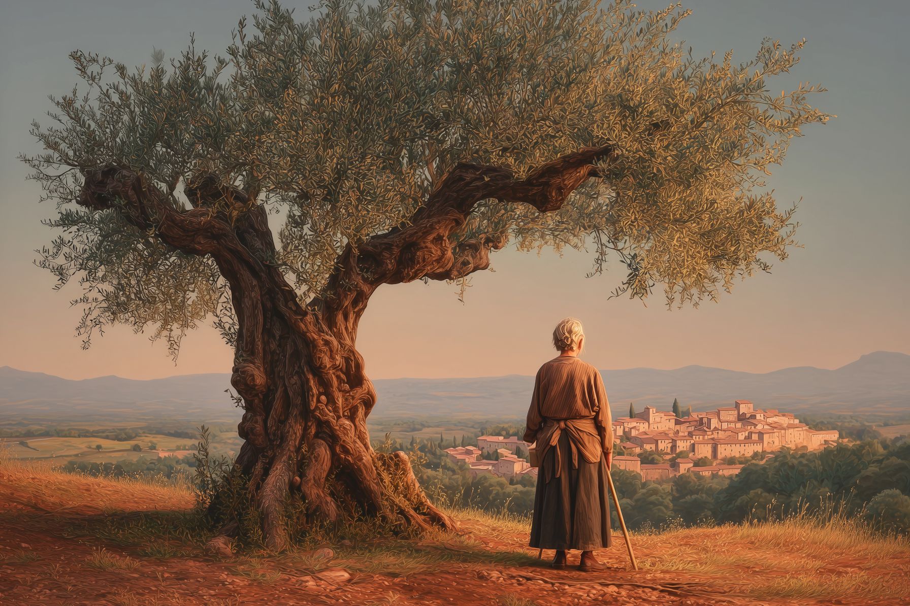 Elderly Spanish Matriarch standing proudly beneath the massive, gnarled centennial olive tree, both positioned on a sloping terracotta field, distant hazy view of a small stone village in the background, warm golden hour sunset light and clear sky, cinematic realism, highly detailed book cover illustration