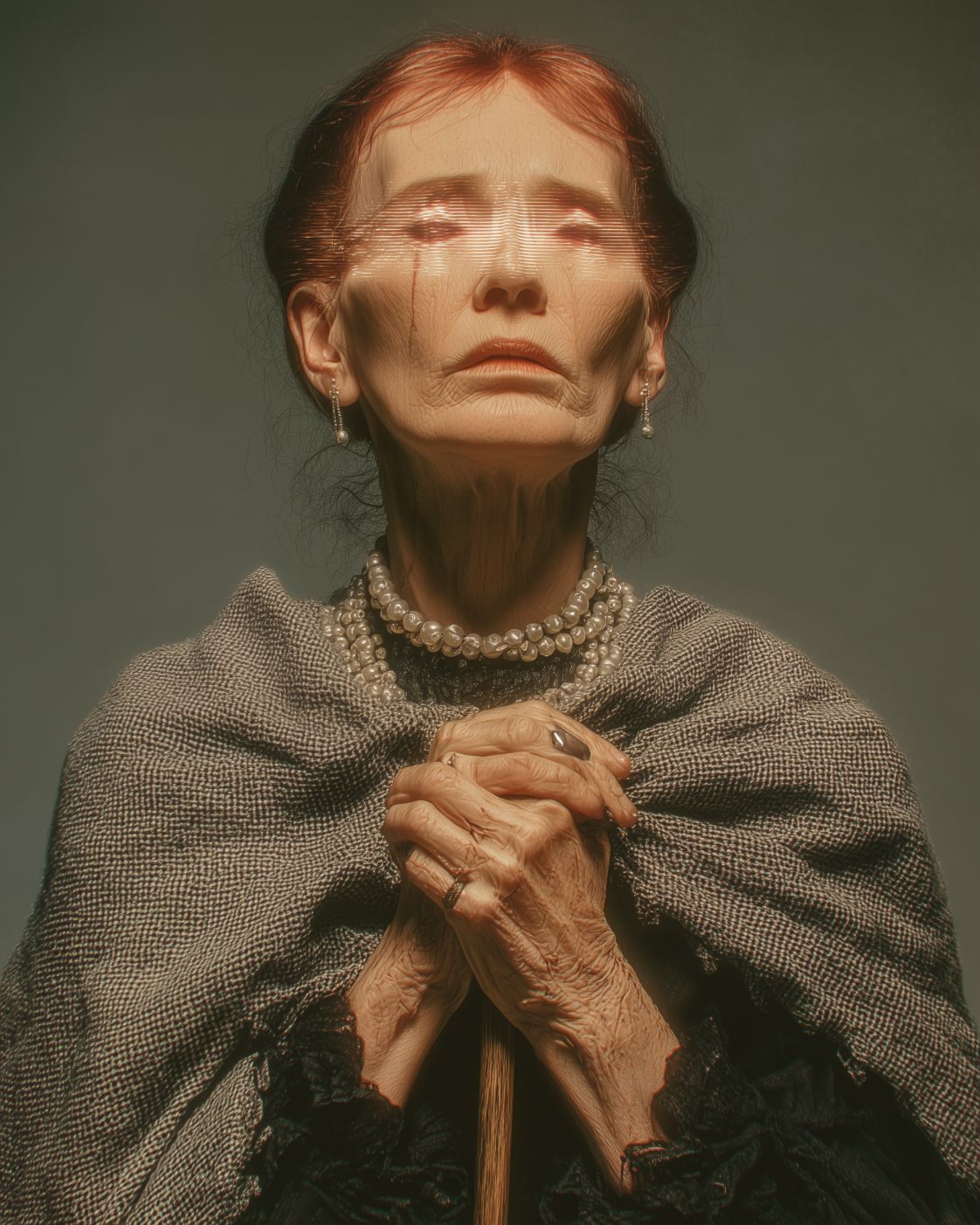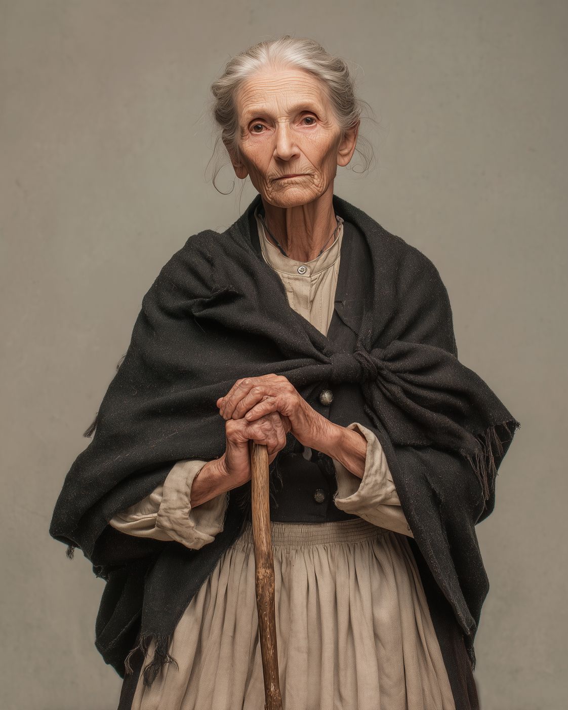 Elderly Spanish woman, Matriarch of the Olive Grove, grey hair tied in a low bun, serene and penetrating eyes, wearing a dark wool shawl over a cream linen shirt and long wool skirt, strong gnarled hands, standing with a dignified pose holding a wooden walking stick, simple neutral background, photographic portrait, hyperdetailed realism, studio lighting --ar 4:5