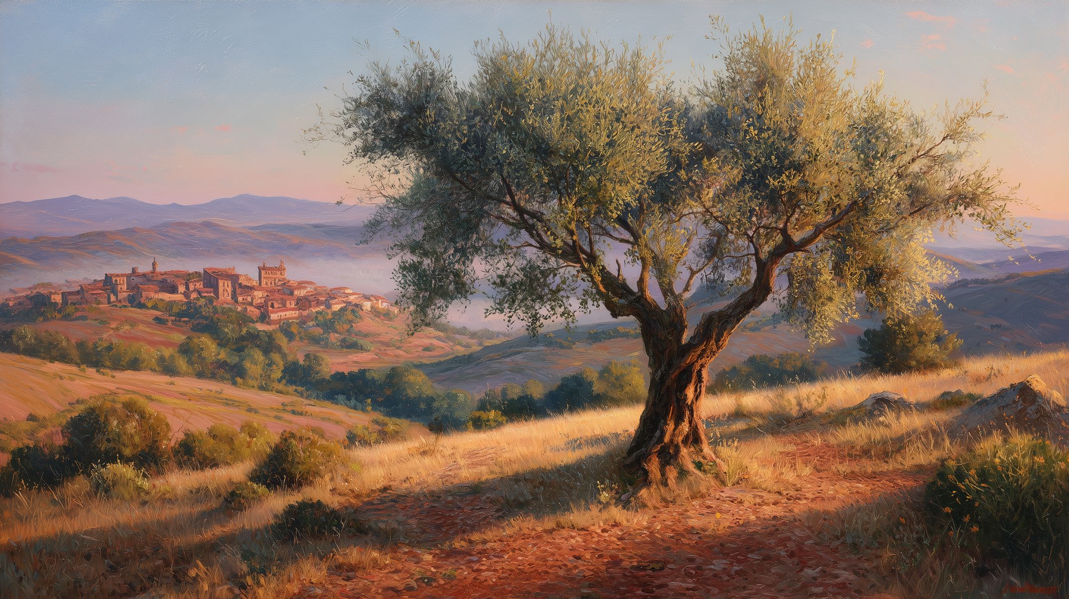 Wide shot of an ancient, gnarled olive tree with widely spreading branches, standing alone on a sloping terracotta earth field, low fog rolling over distant rolling hills with a small, traditional stone village visible far away, golden hour sunset light, atmospheric, cinematic landscape, realistic oil painting style, high detail --ar 16:9