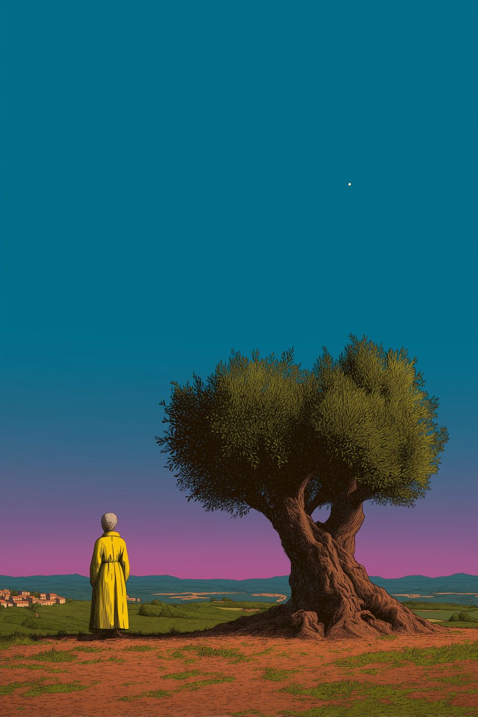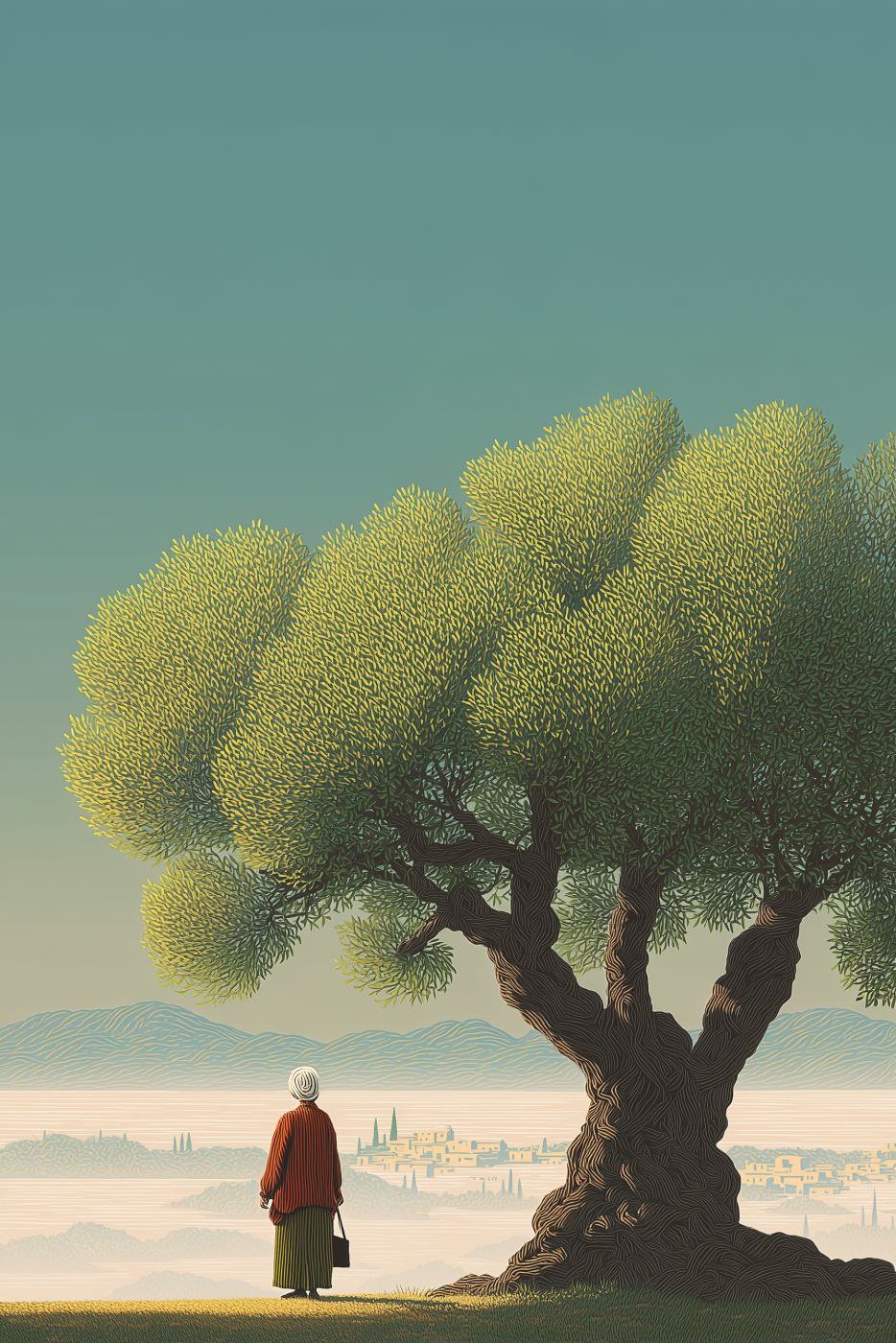 https://s.mj.run/YdlE4sCg8HU Elderly Spanish woman portrait and gnarled olive tree, simplified line art style, clear lines and flat blocks of color, limited color palette (terracotta, olive green, deep blue), minimalist travel poster aesthetic, graphic novel style, clean composition, vast landscape background, high contrast --ar 2:3 --sref 1110536585 --p w279swp --sw 150 --s 750 --exp 20 --sv 6 --v 7.0