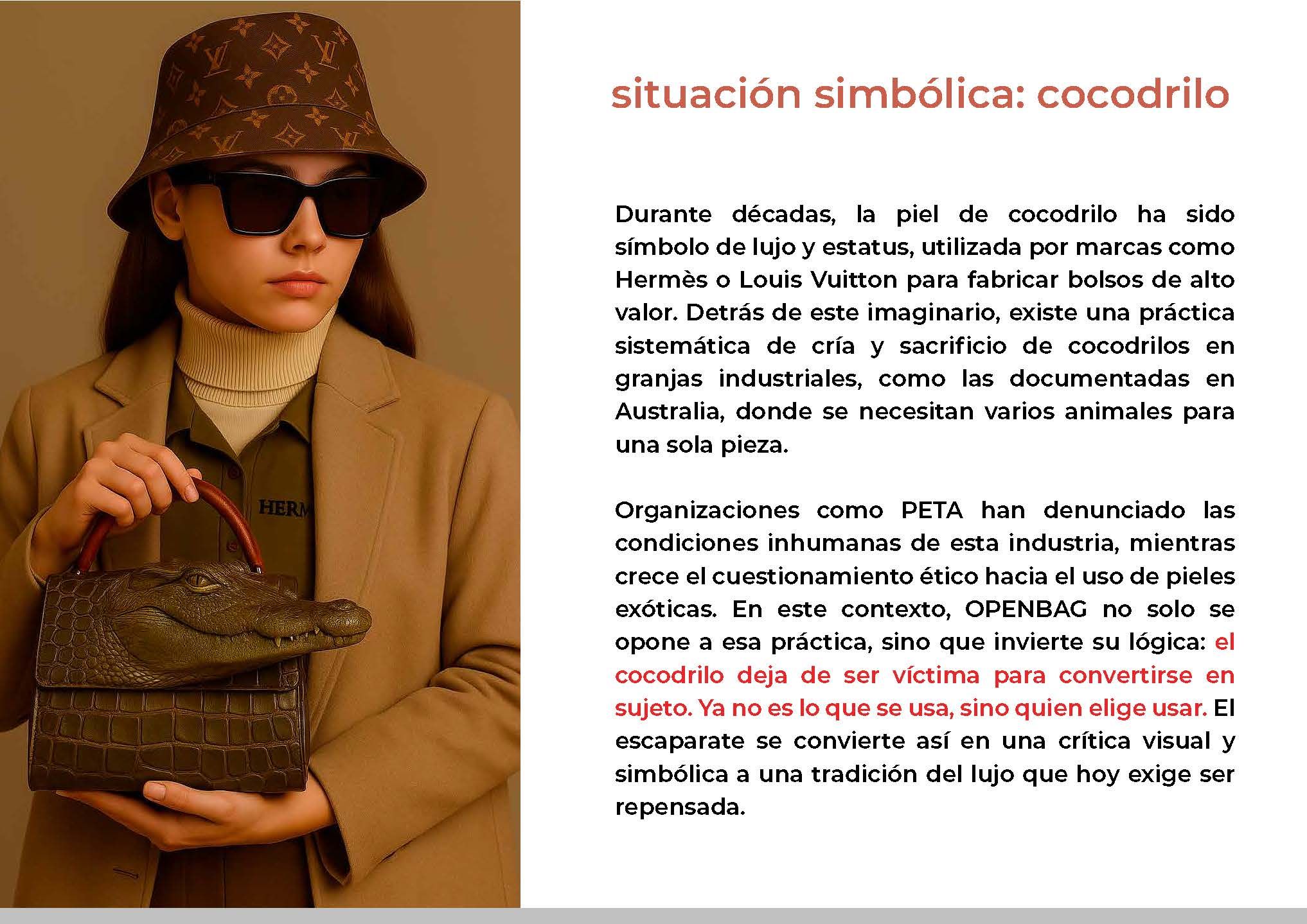 El escaparate se organiza con una vitrina principal (escena narrativa con personajes cocodrilo humanoides y un bolso protagonista) y tres vitrinas secundarias (secuencia fragmentada del cuerpo del cocodrilo como recurso visual). Desarrollé el proceso desde el briefing hasta el resultado final, integrando composición, cromática, materiales, reciclabilidad, iluminación y maqueta física.