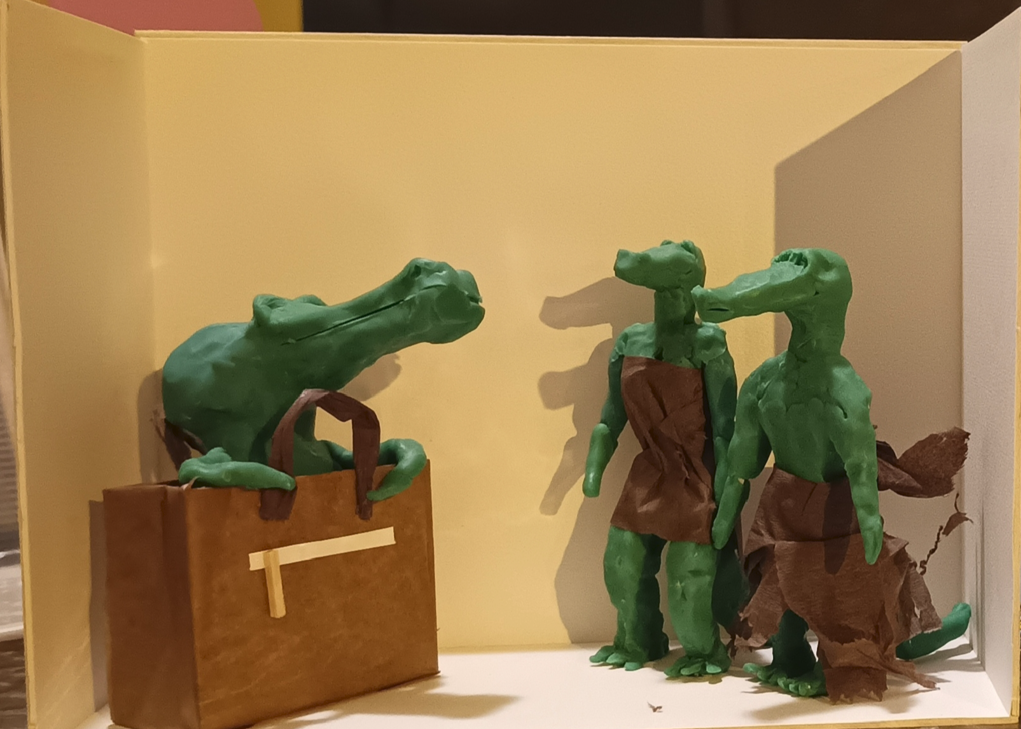 El núcleo del escaparate es el storytelling: una escena que sugiere transformación material y ética. Los cocodrilos humanoides funcionan como metáfora visual de “piel/cuerpo/material”, mientras el producto se mantiene como protagonista real. La idea era generar una vitrina con lectura inmediata (impacto) y una lectura secundaria (significado), sin perder elegancia.