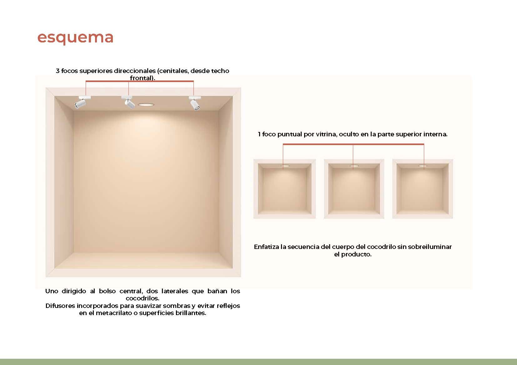 Vitrinas secundarias: un punto de luz superior por vitrina, controlado, para enfatizar la secuencia sin sobreiluminar.