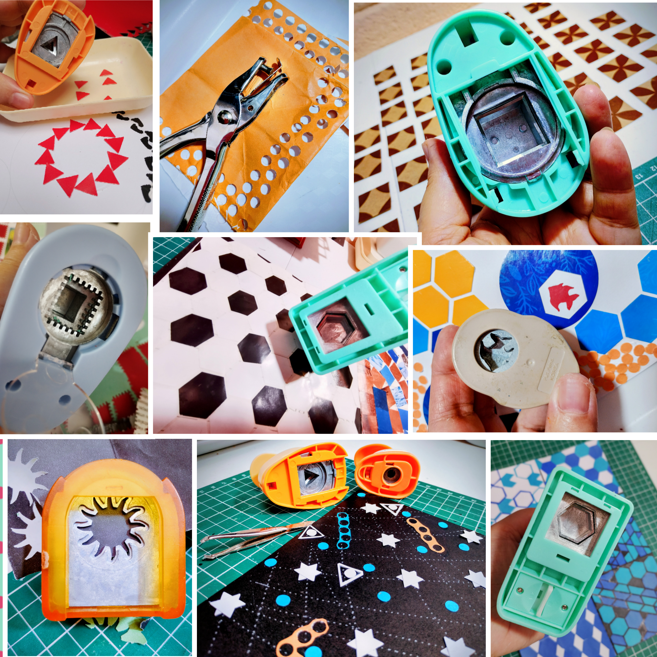 Cortadores de papel com formas geométricas e orgânicas, papéis de embalagem, retalhos de colorset, revistas