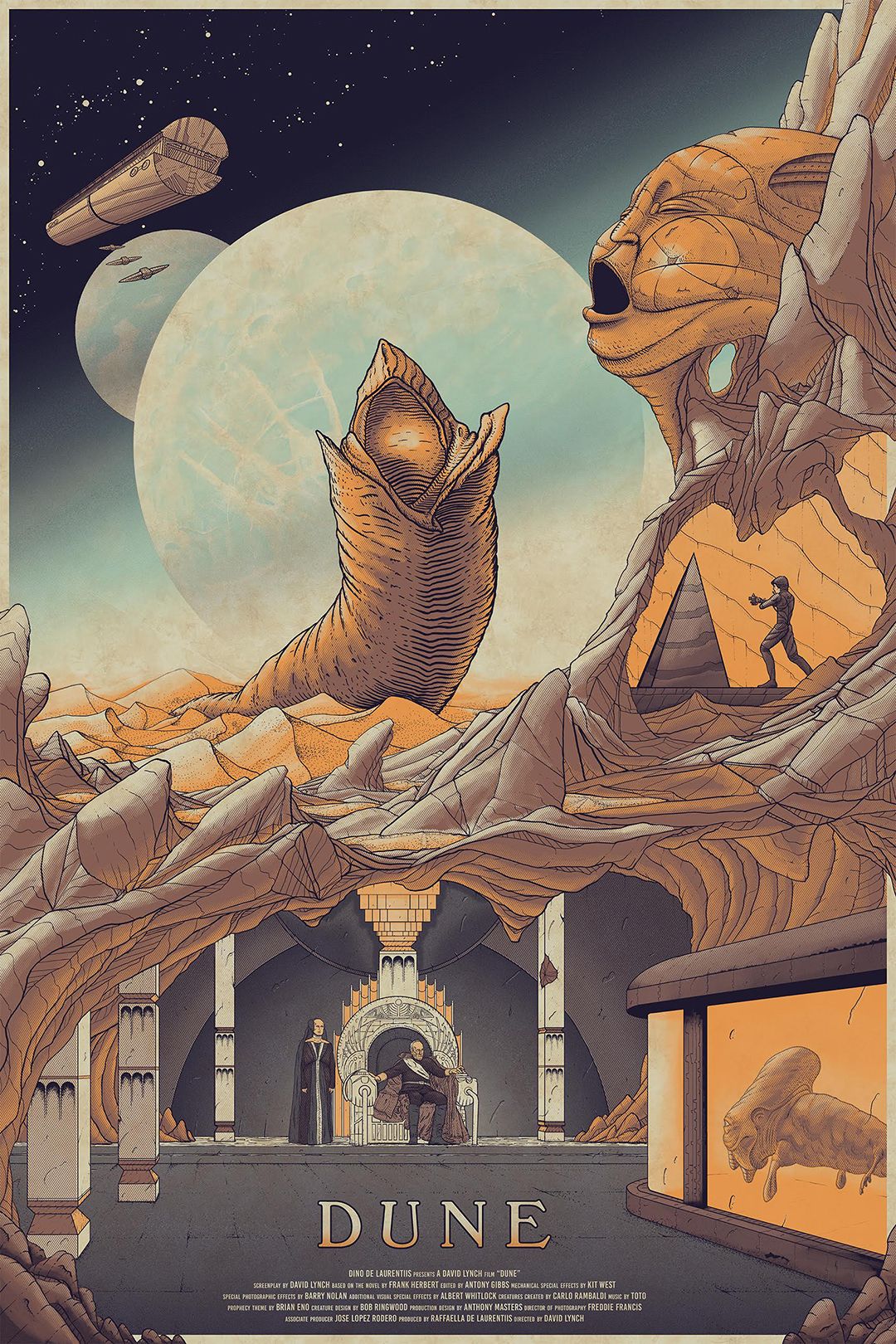 Poster en serigrafía de Dune de David Lynch encargado por Cult Classic Prints. 24″x36″, 4 tintas en papel Keaykolour Parchment Aged.