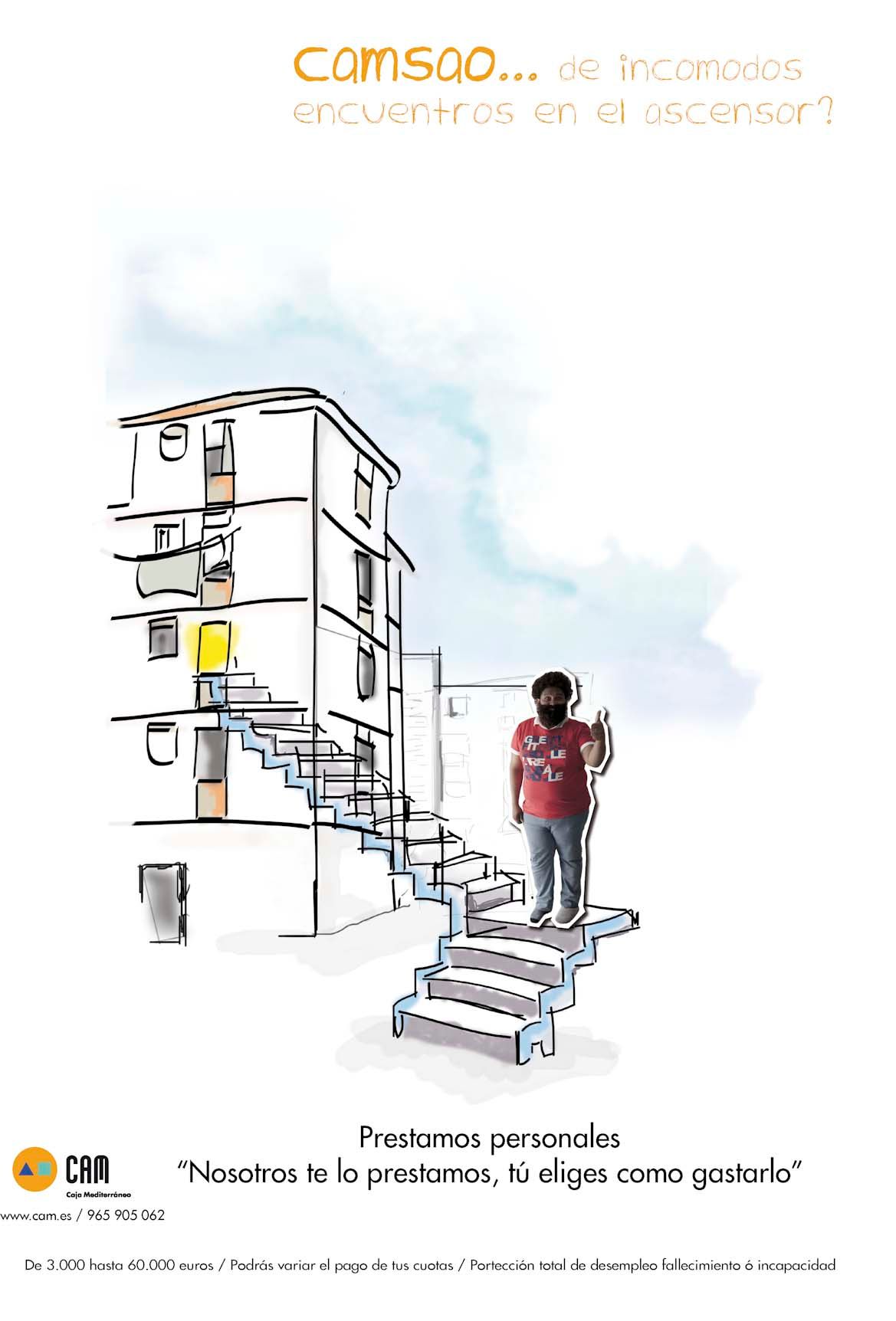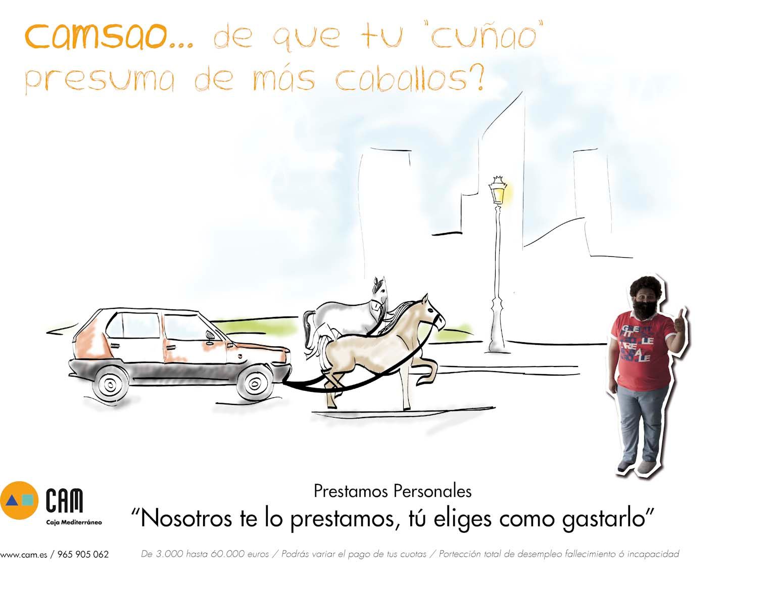 La propuesta basicamente consistia en promocionar creditos personales. Nuestro claim, "tú eliges como gastarlo" llevandolo a la lógica de lo absurdo, tratamos de mostrar que cualquier idea, por absurda que parezca no importaba a la hora de concederte un crédito. Para ello usamos la figura del CAMSAO, haciendo un juego de palabras con el nombre del cliente, CAM, este personaje propone soluciones poco inteligentes a sus problemas, pero no por ello se queda en el intento, y es que la CAM no se inmiscuye, simplemente te ayuda a conseguirlo.